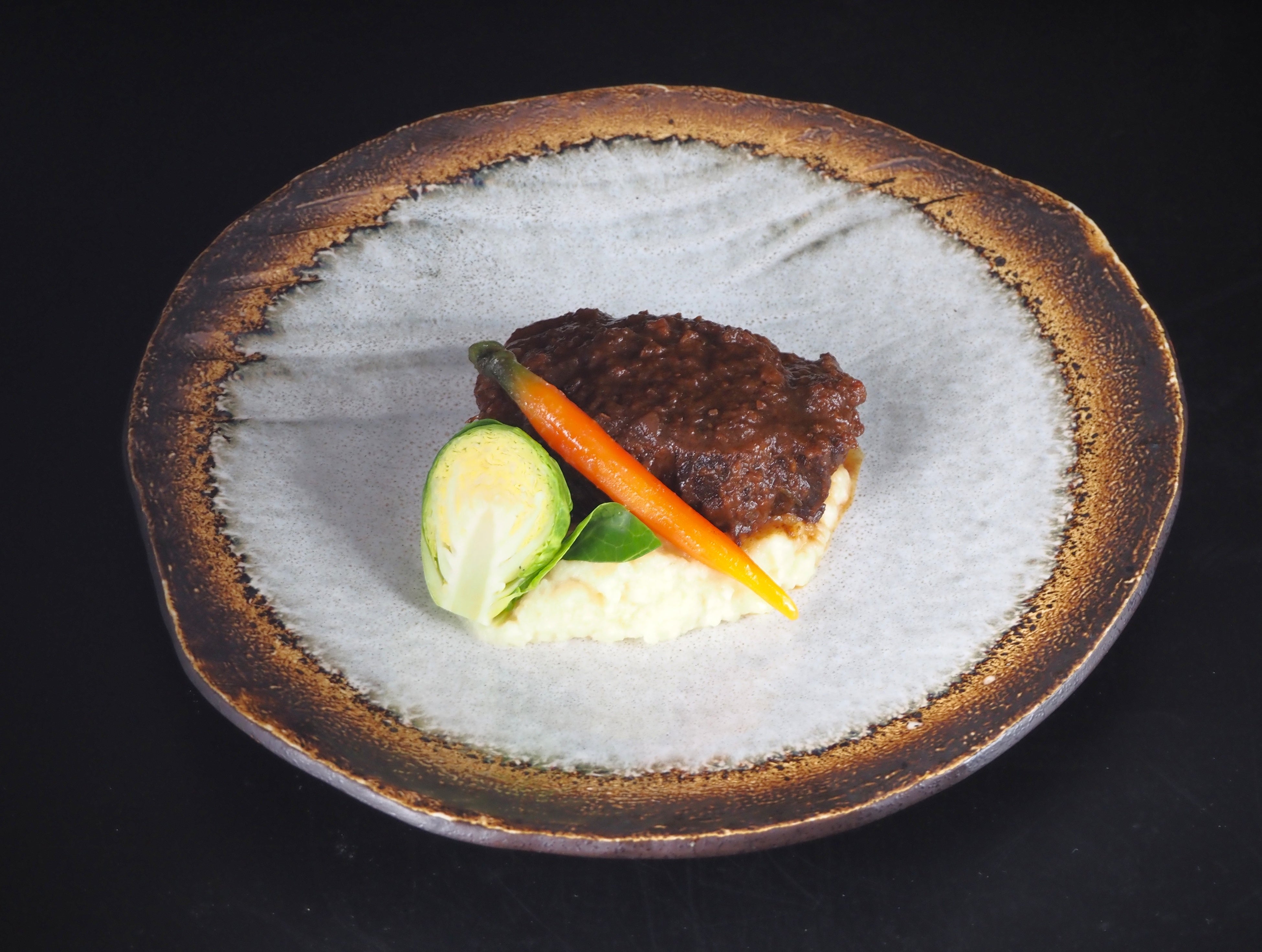 メインディッシュには、牛タンをイタリア・ピエモンテ州の赤ワイン「バローロ」でじっくりと煮込んだブラサートをご用意。ナイフがスッと入るほど柔らかく煮込まれたお肉は、口の中でほろりとほどける食感。じゃがいものピューレとともに、深みのある味わいをお楽しみください。