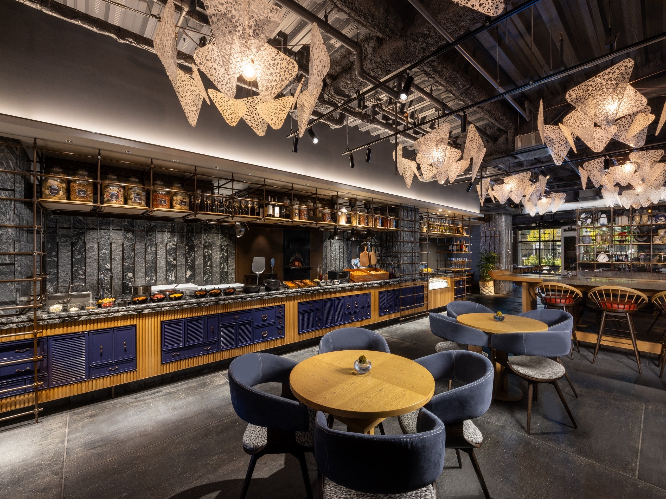 イタリアの大衆食堂をイメージした「TRATTORIA M KYOTO」 。”曲水の宴”をコンセプトとし、貴族が優雅且つ豪華絢爛に宴を楽しむ様子を遊び心感じられる演出で表現しています。