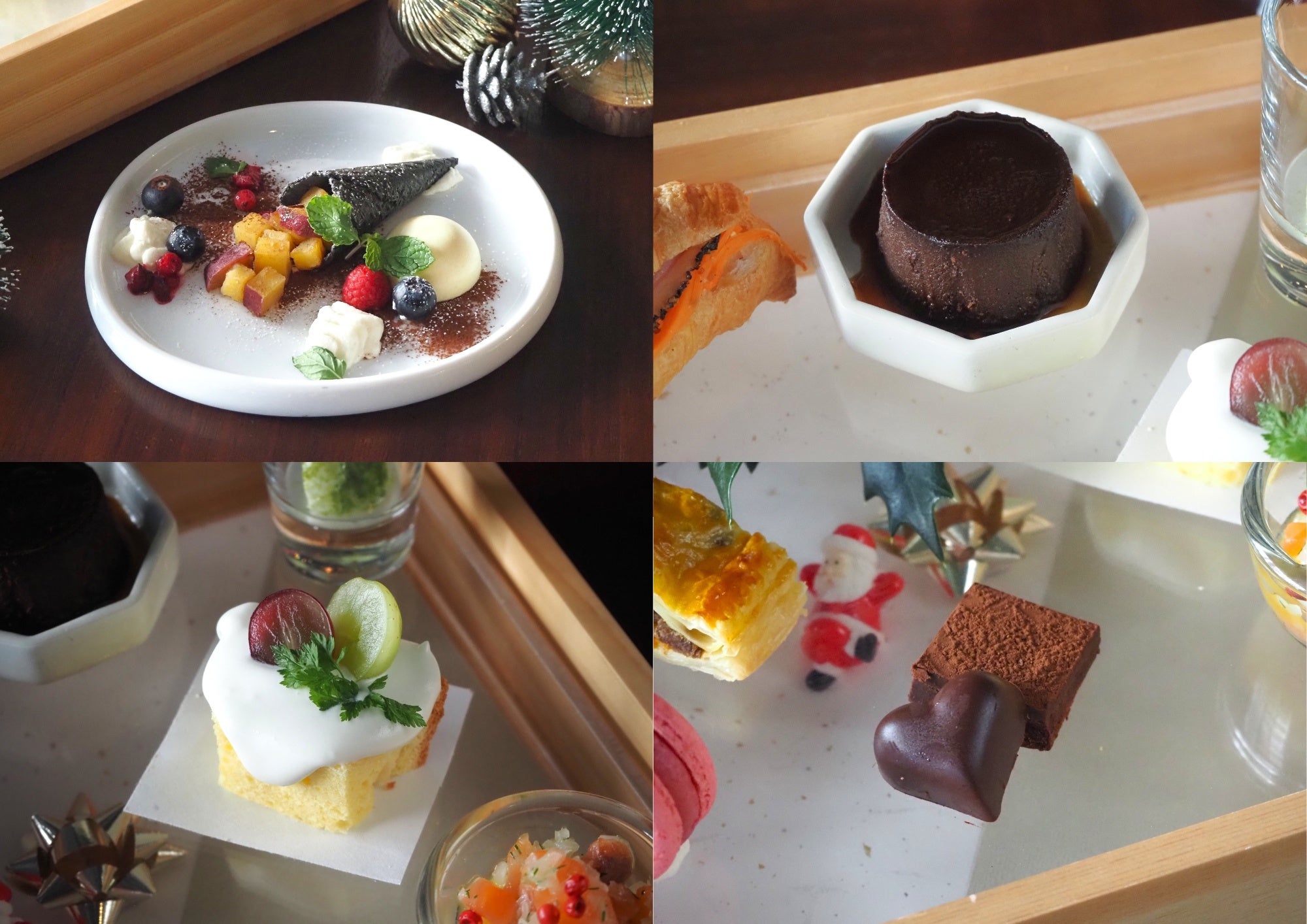 左上「さつまいも塩バターコーン~さつまいもムースとメープルシロップのクリーム添え~」、右上「ボネ」、右下「紅茶とアプリコットのボンボンショコラと生チョコ」、左下「ショートケーキ仕立てのシフォンケーキ」