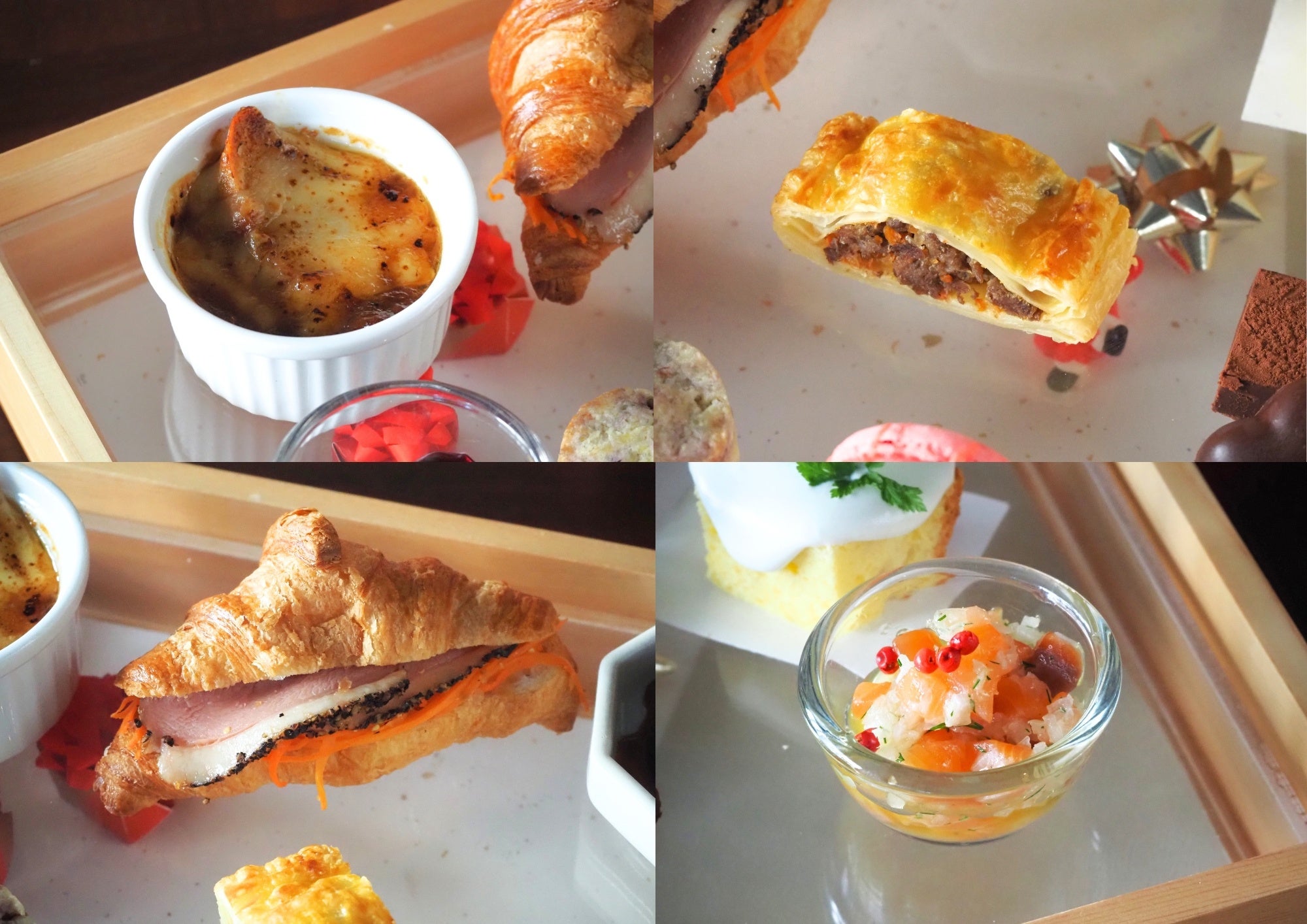 左上「オニオングラタンスープ」、右上「ミートパイ」、右下「サーモンと玉ねぎのタルタル」、左下「キャロットラペと鴨のクロワッサンサンド」