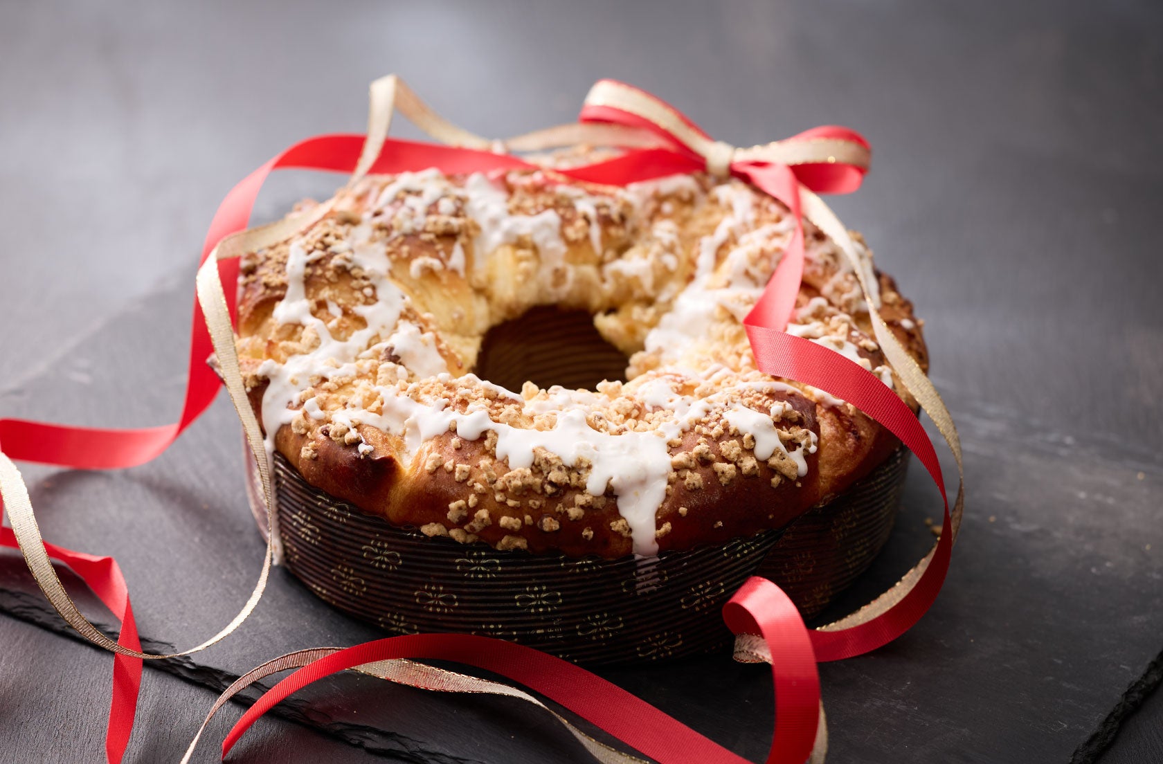 ケーキクラムを加えたしっとり生地に、甘酸っぱいりんごフィリングを巻き込み、アイシングで華やかに仕上げた菓子パン。クリスマスリースをイメージして焼き上げた、見た目もかわいらしい一品です。