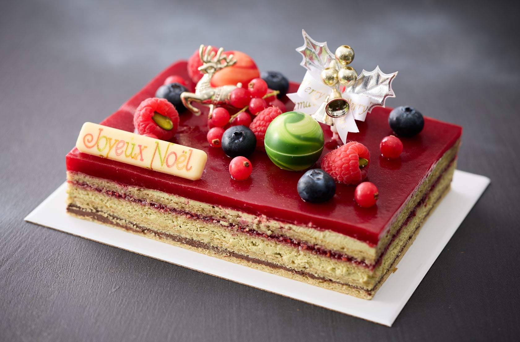 ピスタチオジョコンドに、濃厚なピスタチオのバタークリーム。甘酸っぱいフランボワーズジャムと生チョコが織りなす層に、とろりとしたフランボワーズのクーリーが華やかなアクセント。素材の個性を丁寧に重ねた、まるで芸術作品のような一品。ひと口ごとに広がる香りと味わいが、聖夜を彩る特別なひとときを演出します。