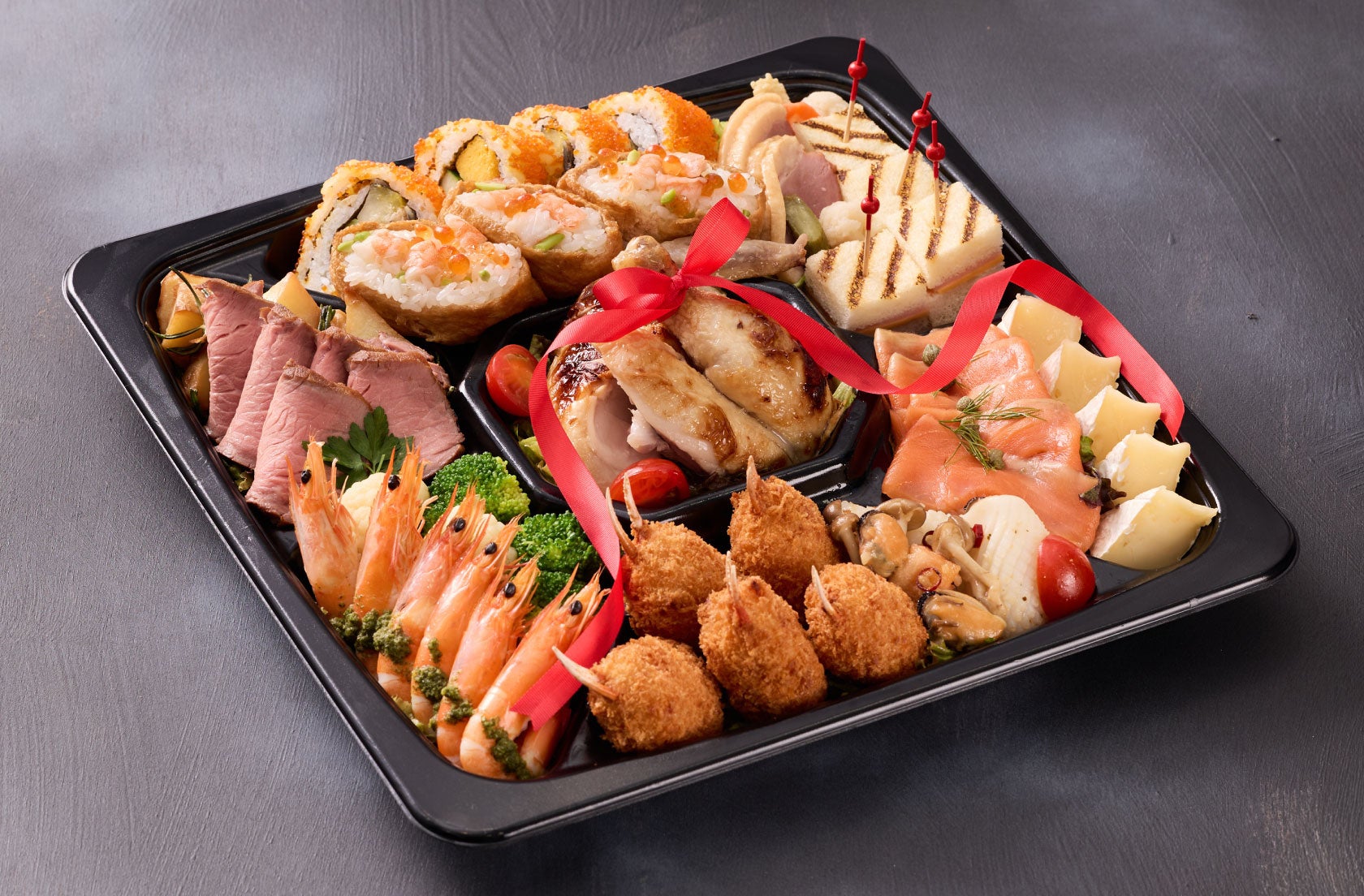 沖縄県産若鶏のローストをはじめ、和・洋・中の人気メニューを贅沢に詰め込んだ特別なひと箱。寿司やサンドイッチ、燻製、アヒージョ風など、聖夜の食卓を華やかに彩ります。