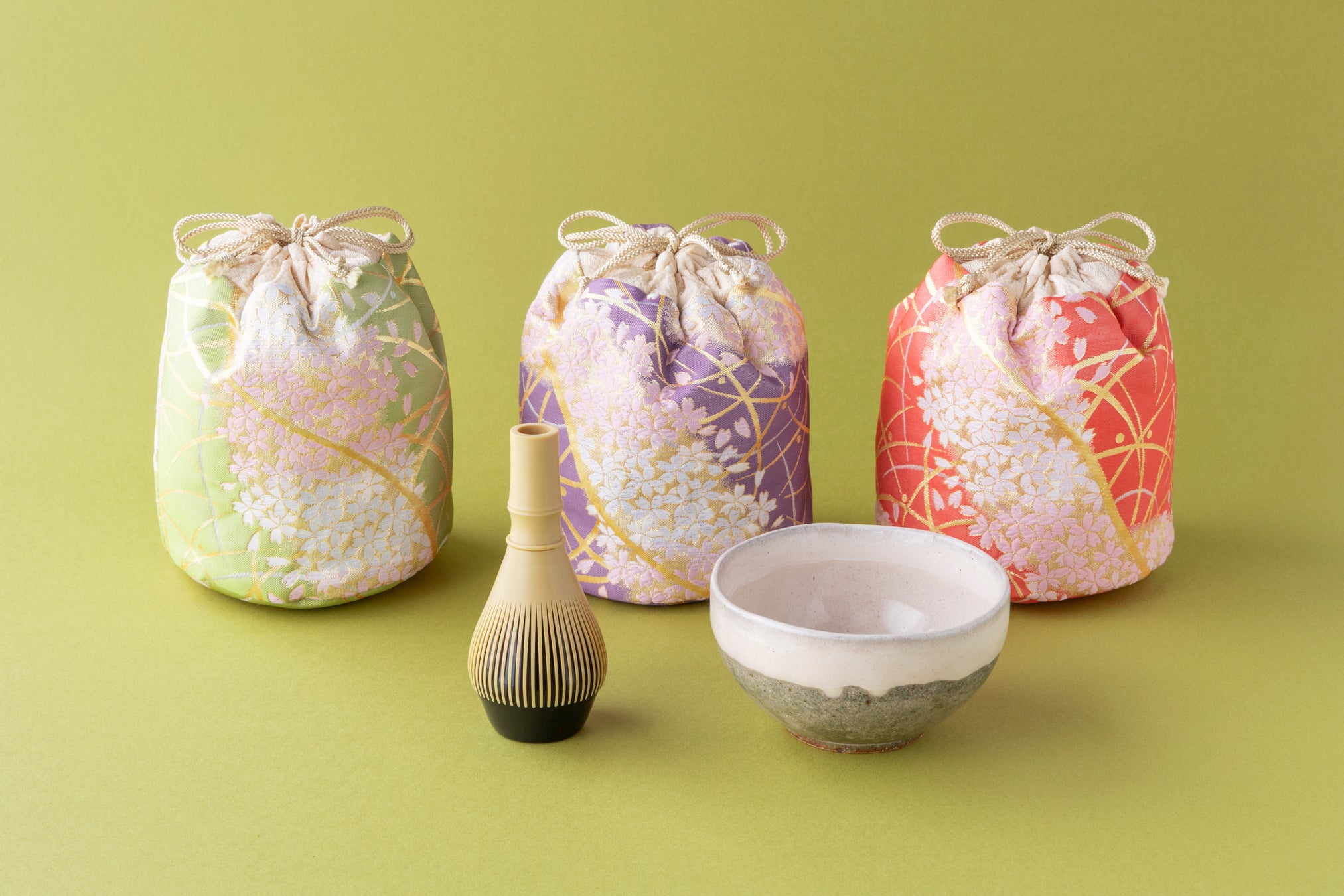 おでかけ抹茶セット「旅碗」旅先でも抹茶を楽しめるよう、小ぶりのオリジナル茶碗と扱いやすい樹脂製の茶筅を、華やかな西陣織の巾着に入れたセットです 。京都土産としても最適です。