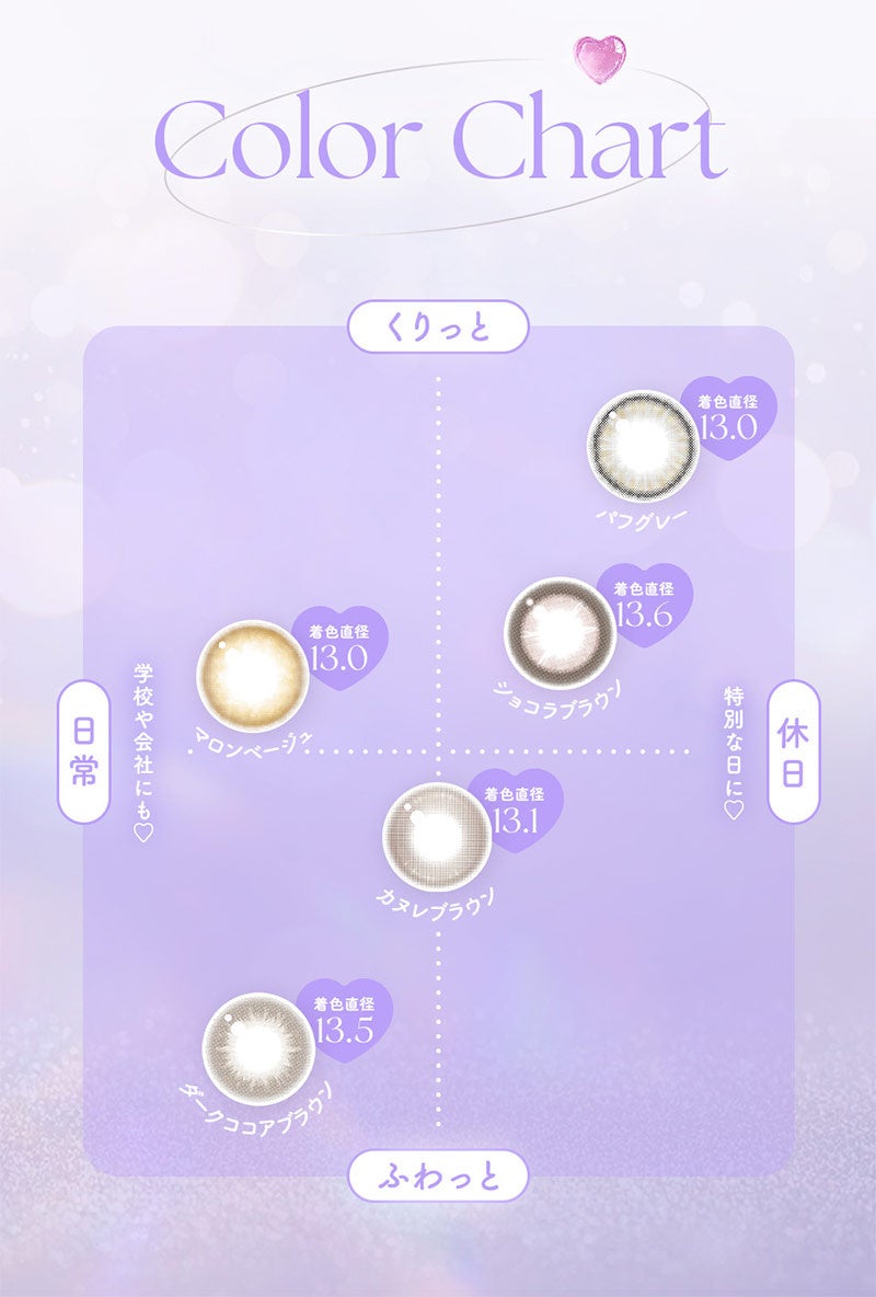 Puffmeeは、“瞳の色を印象的に見せること”にこだわりました。レンズカラーをトレンドのくすんだトーンにすることで、瞳の色に馴染みながらもどこかミステリアスな印象を与え、水光カラコンで水面に光が差し込んでいるかのうようなウルウル感で瞳を魅力的に演出します。
