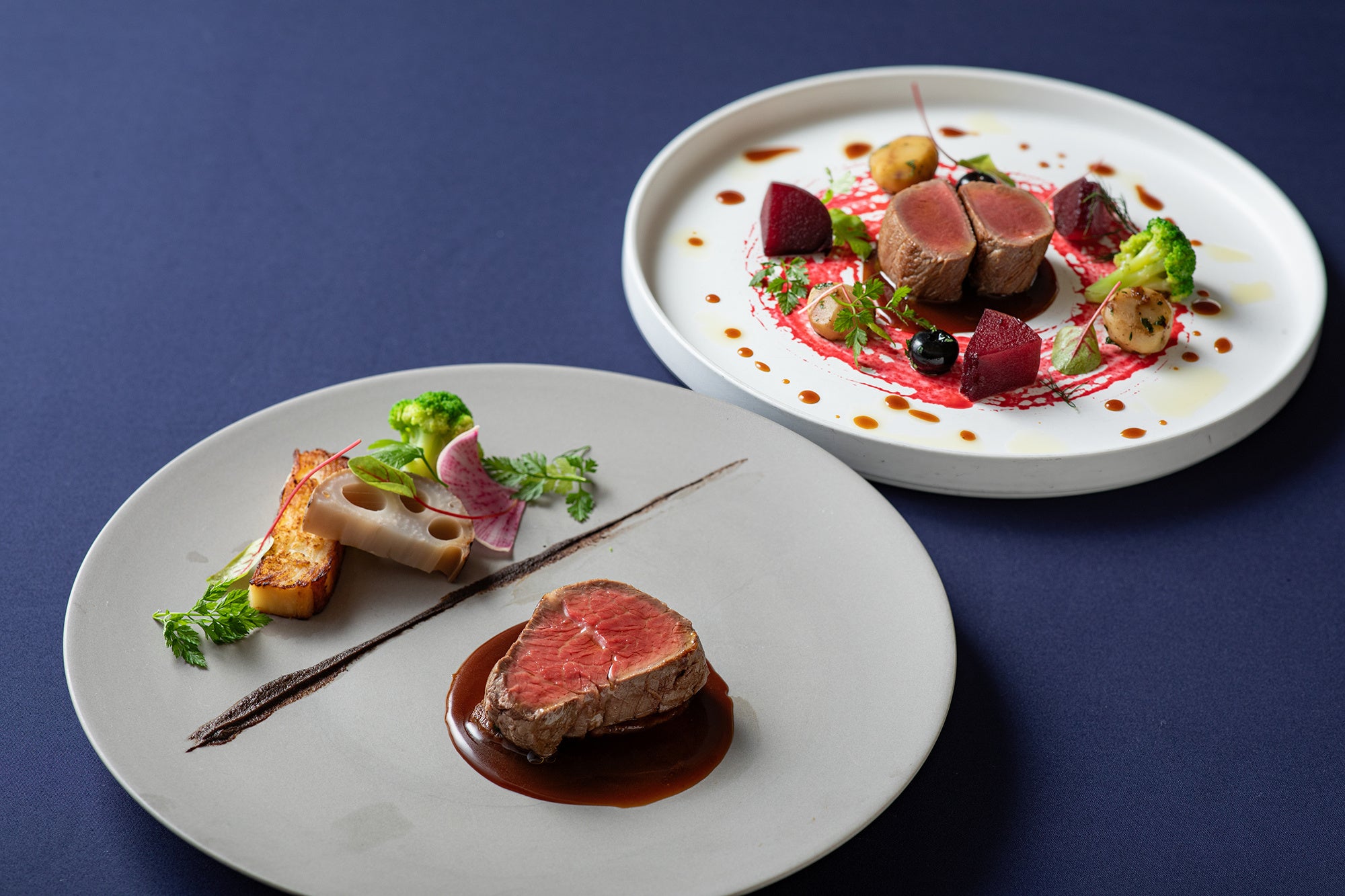 画像下:国産黒毛和牛フィレ肉のロースト 、右上:富士の裾野より届いたエシカルな鹿肉のロースト