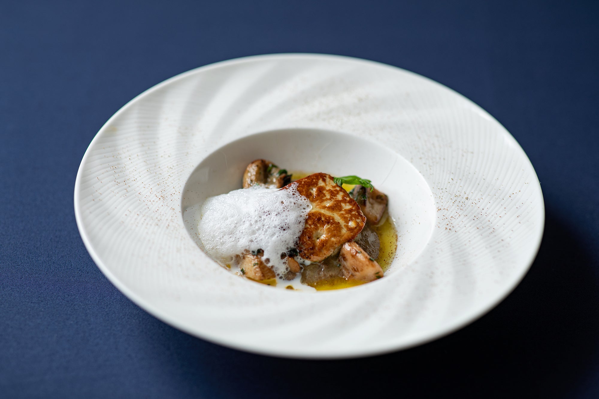 淡雪を浮かべたフォアグラのソテー イタリア産ポルチーニ茸のピュレとともに