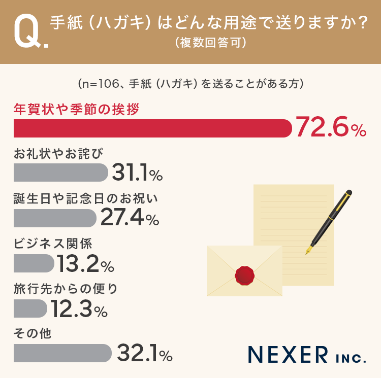 最も多かったのは「年賀状や季節の挨拶」で72.6%でした。文化的・儀礼的な挨拶の手段として保たれているようです。