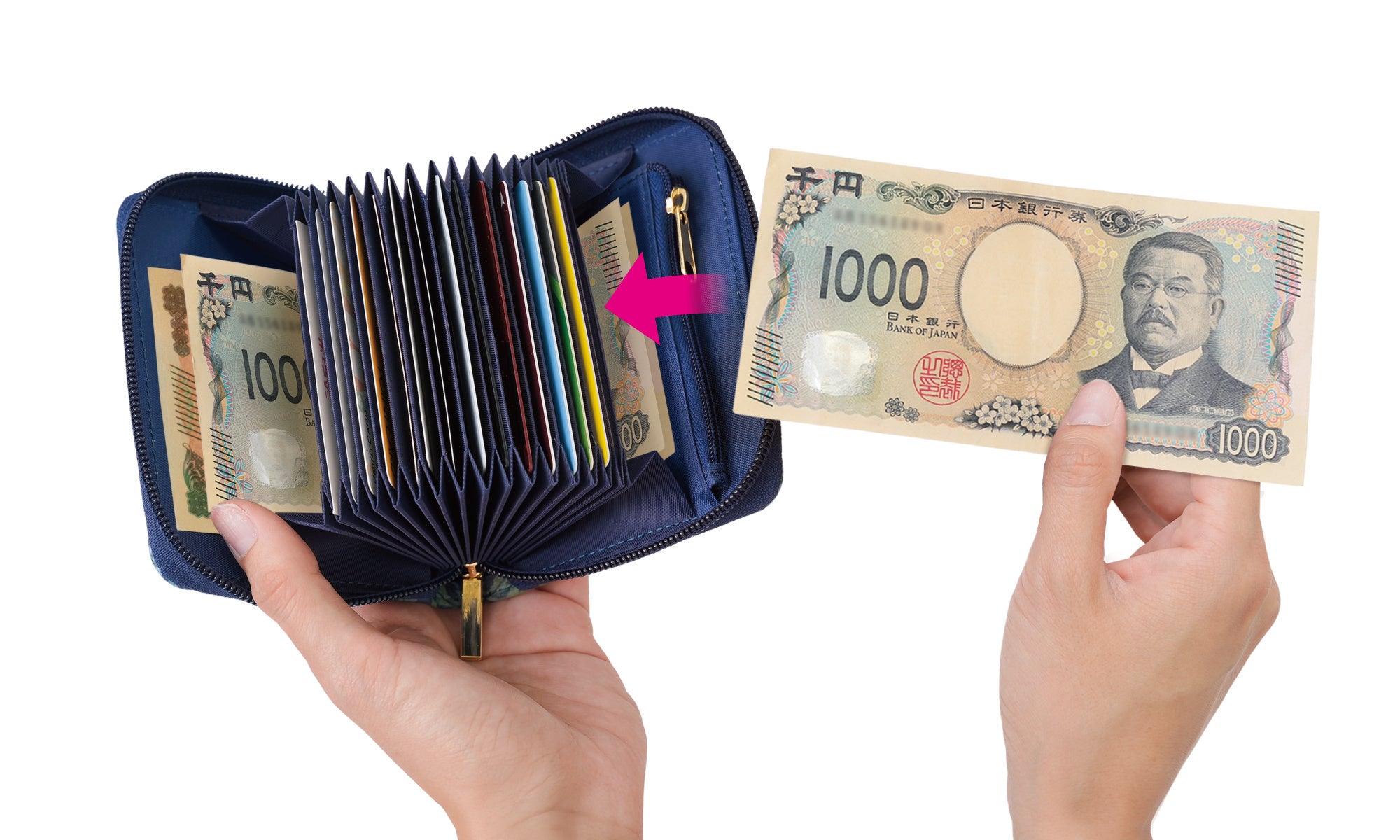 お札やレシートはジャバラの下に滑り込ませるだけで折らずにスッと入れられるスルー設計。