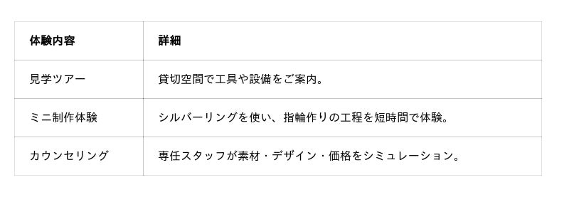 初めての方でも安心して楽しんでいただけるよう、経験豊富なスタッフが丁寧にサポートいたします。大切な方と一緒に、指輪作りを通して「思い出をかたちに残す」体験をぜひお楽しみください。