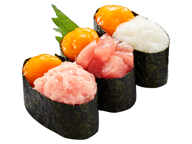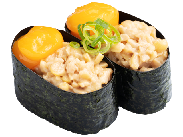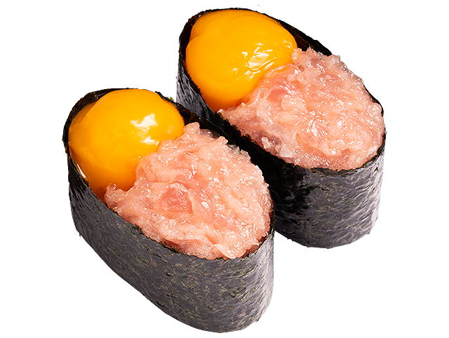 『卵黄ねぎとろ軍艦』二貫110円(税込)~とろける卵黄とねぎとろが織りなす、極上の口どけ。