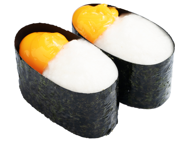 『卵黄とろろ軍艦』二貫160円(税込)~卵黄の濃厚さと、とろろのまろやかさが絶妙に絡む一皿。