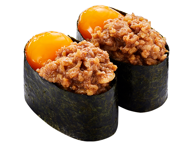 『卵黄牛しぐれ煮軍艦』二貫160円(税込)~甘辛牛しぐれ煮に卵黄がとろり、旨み溢れるお肉の軍艦!