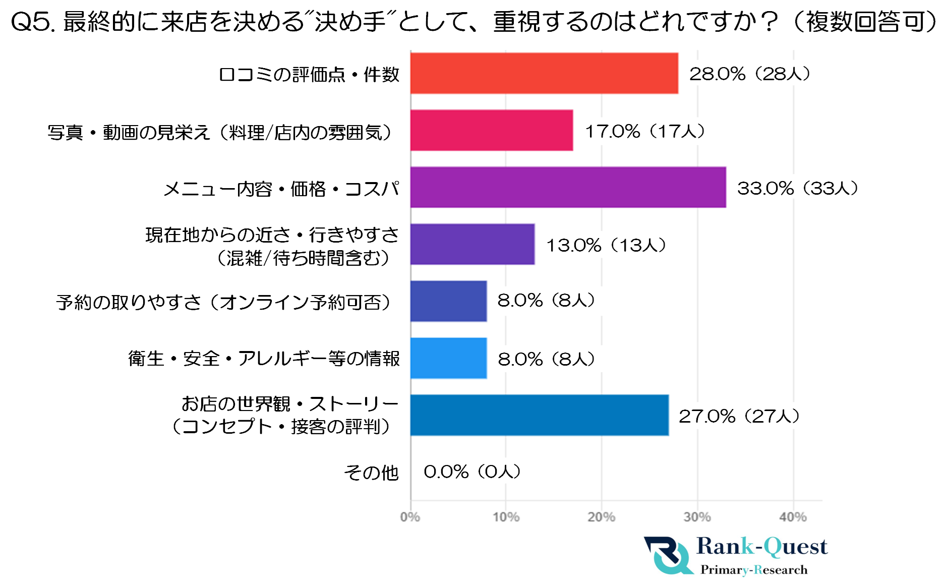 - 「お店の世界観・ストーリー(コンセプト・接客の評判)」も27.0%(27人)と高く、単なる食事以上に“体験”を重視する価値観が広がっている点が印象的です。