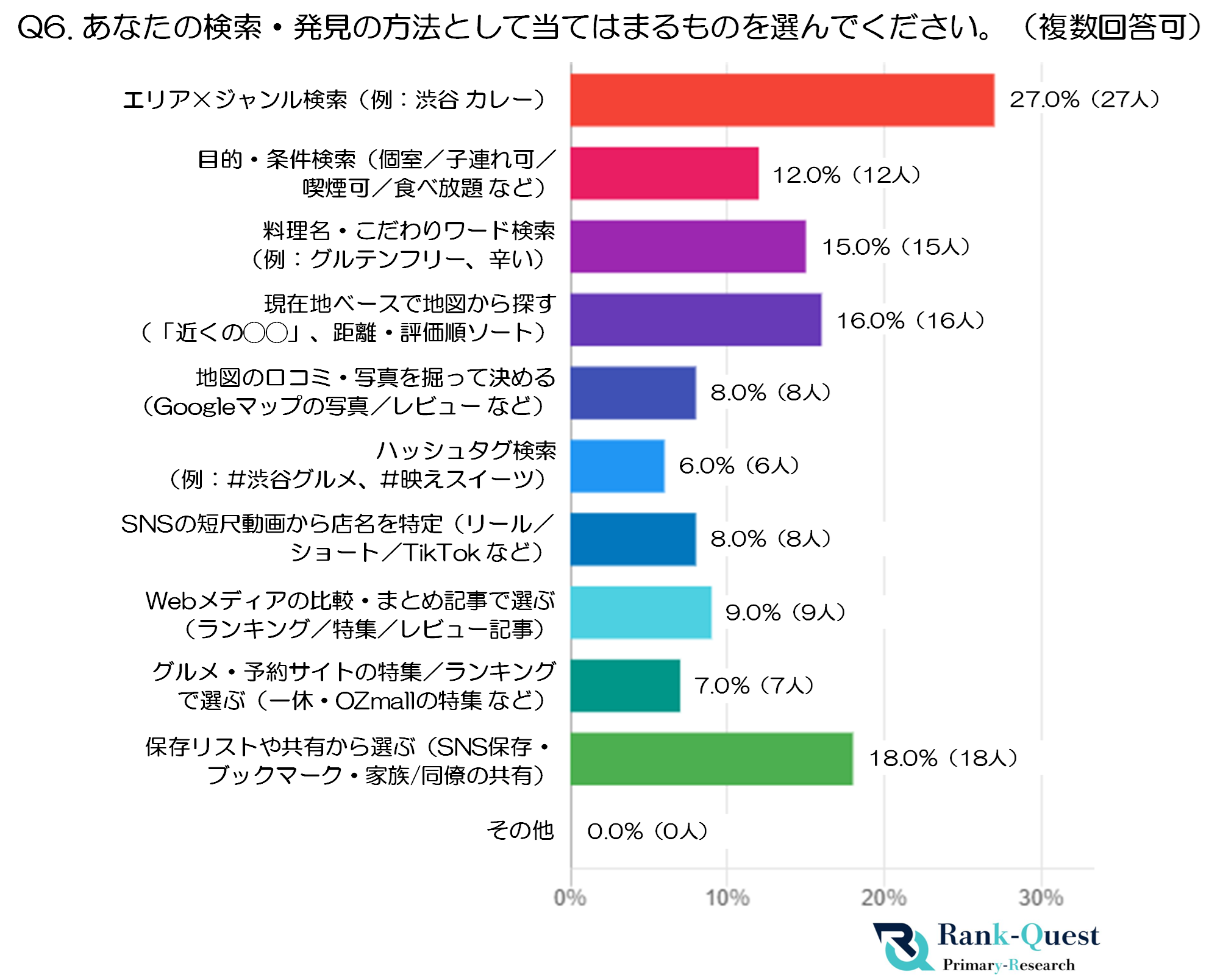 - 最も多かったのは「エリア×ジャンル検索(例:渋谷 カレー)」で27.0%(27人)でした。行きたい地域と食べたい料理を組み合わせたシンプルな検索方法が主流であり、効率よく候補を絞り込める利便性が支持されていることがうかがえます。