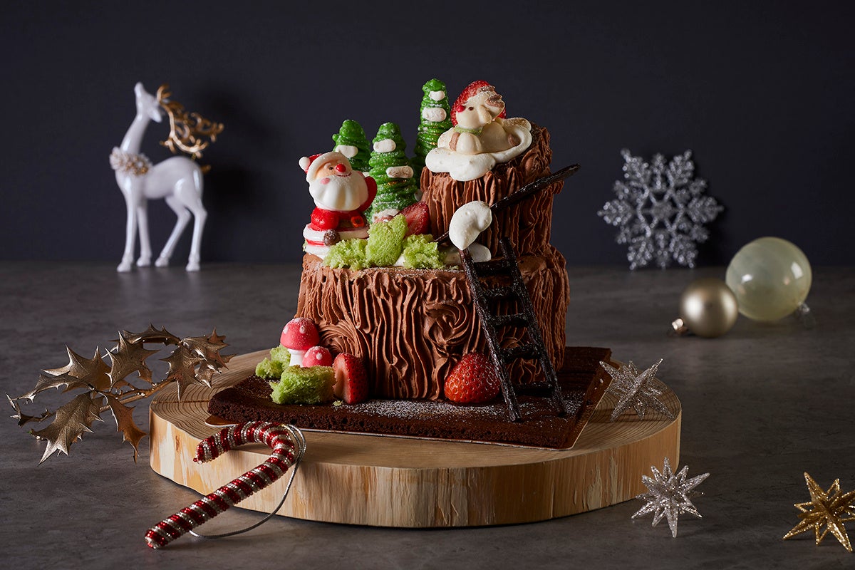 スイスチョコレートの濃厚でまろやかなクリームとスポンジ生地を巻き上げた切り株の土台に、森で遊ぶサンタクロースとトナカイのデコレーションで可愛らしく仕上げました。