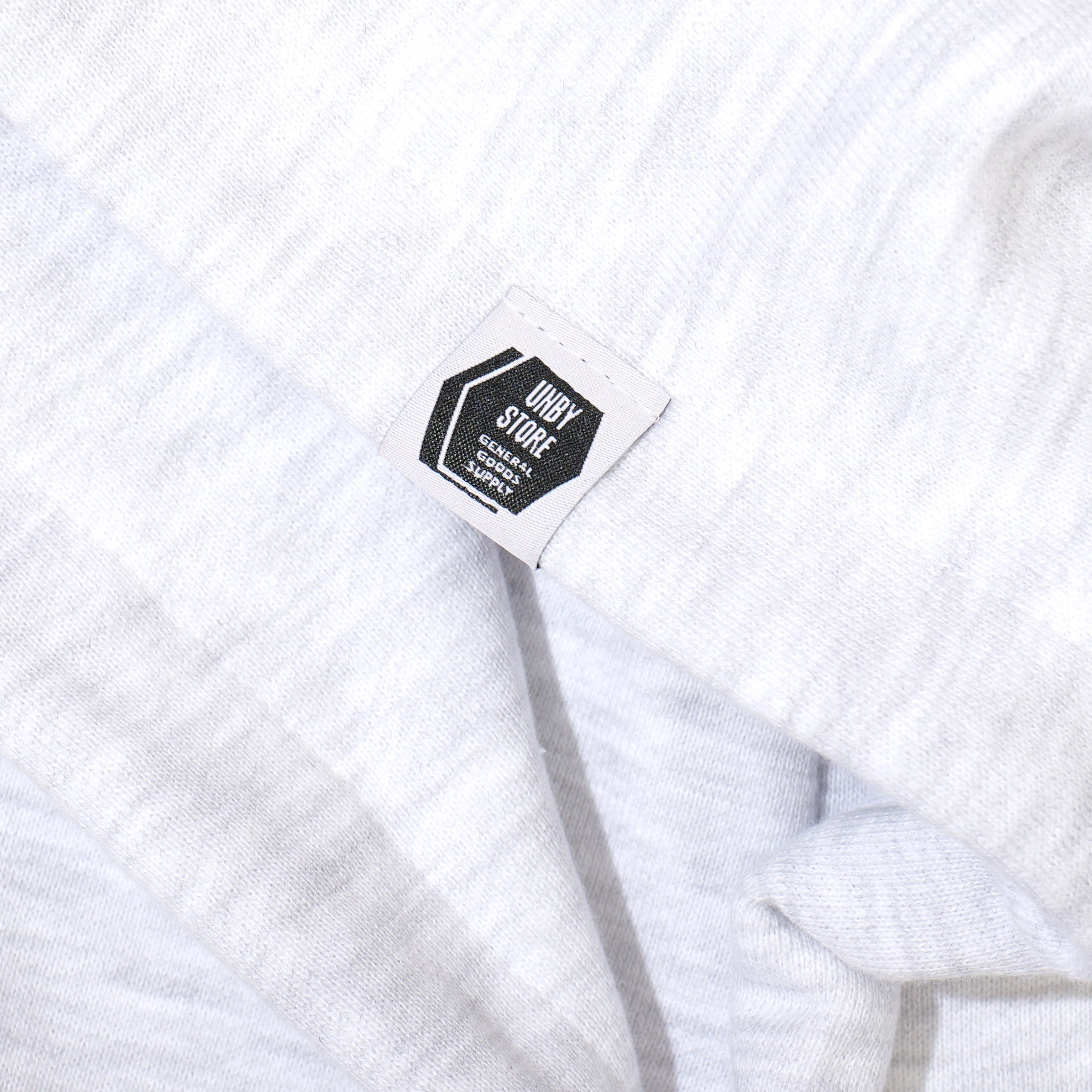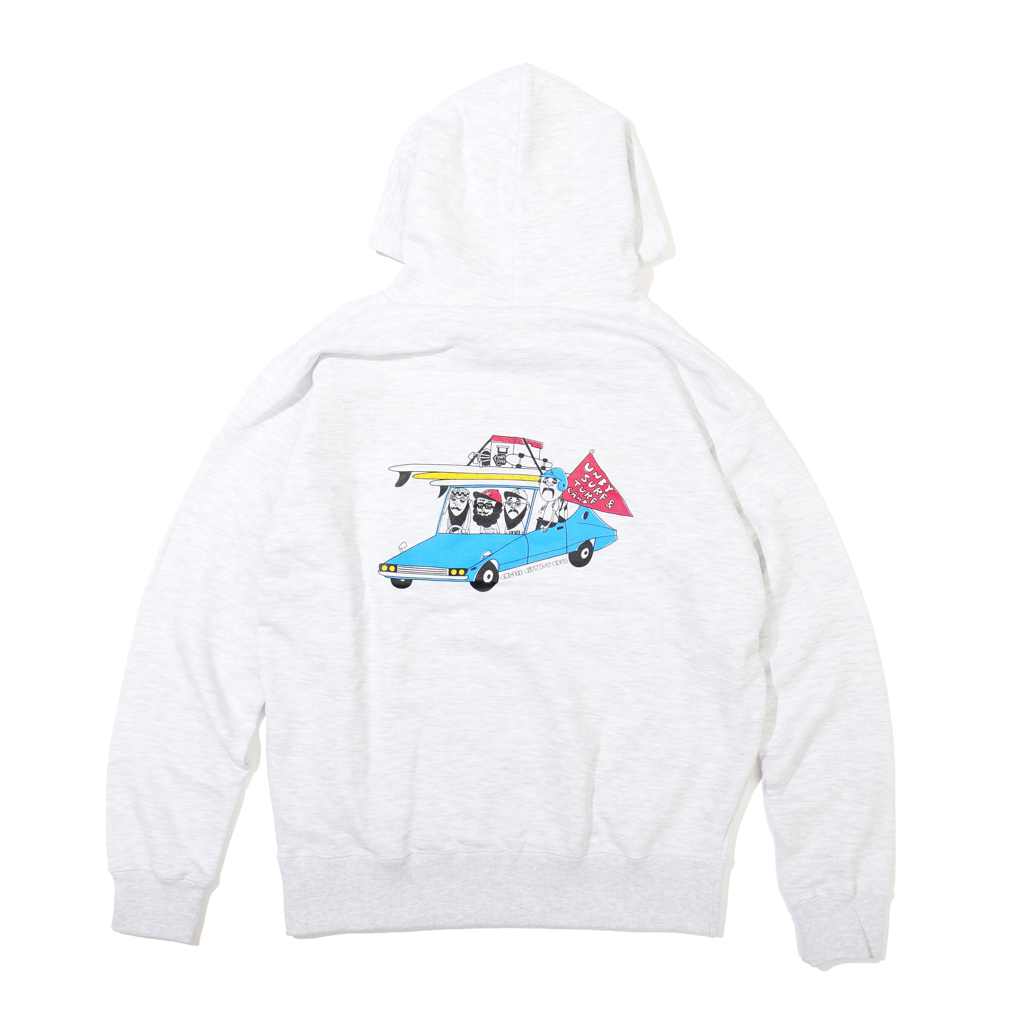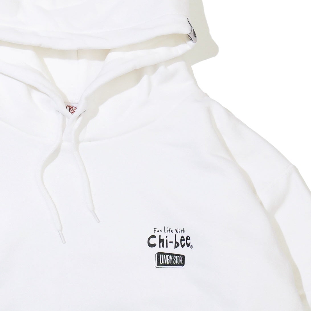 ボディには10ozの裏パイル生地を採用し、比較的着用シーズンが長く、様々なシーンで活躍します。胸元にはchi-beeとUNBYのオフィシャルロゴを並べて配置。フード部分にはUNBYオリジナルのピスネームをあしらい、さりげないアクセントを加えています。