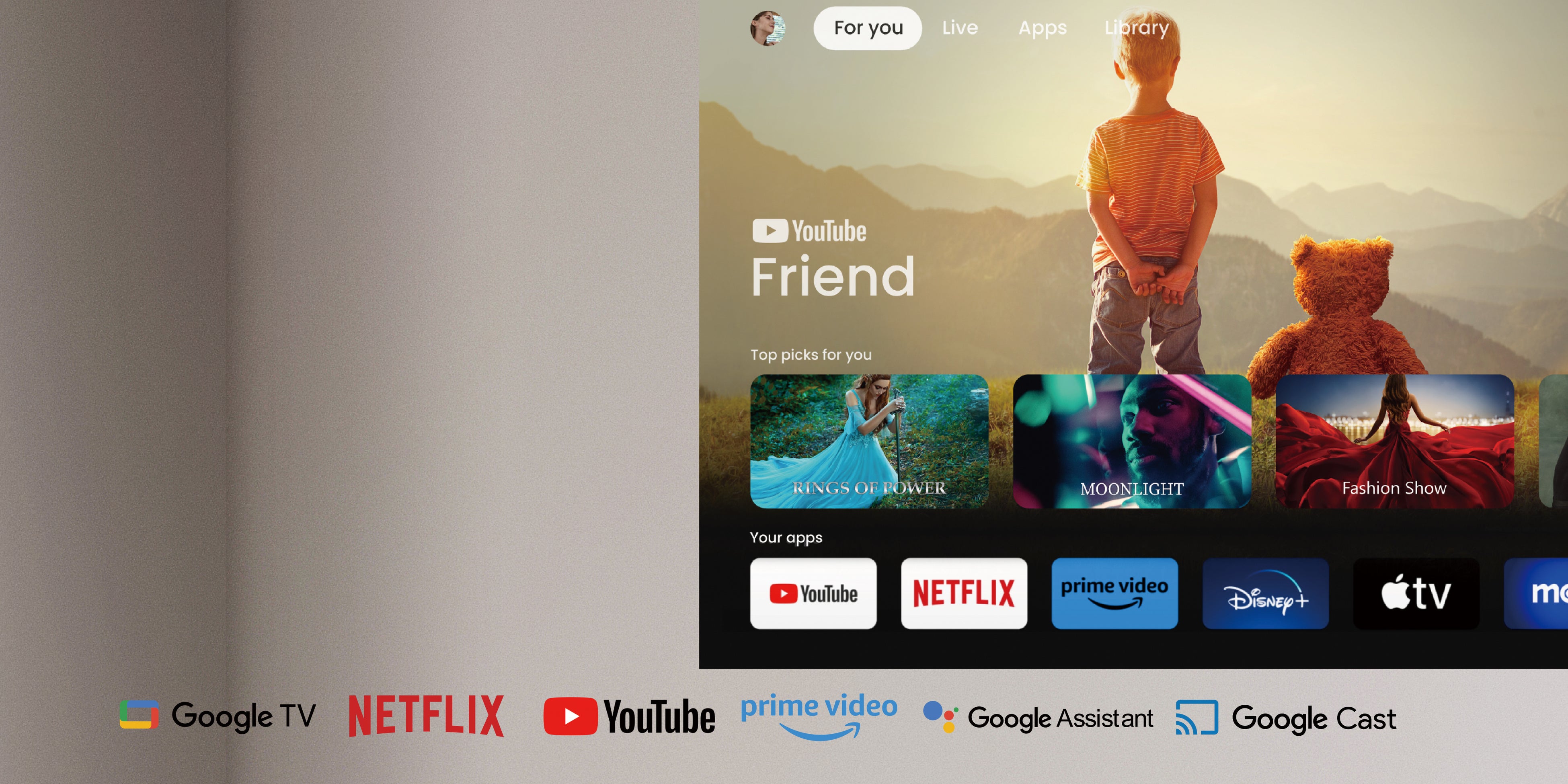 Google TV OSを内蔵し、Netflix、YouTube、Disney+などの認定アプリをシームレスに利用可能です。15,000以上のアプリにアクセス可能で、好みのコンテンツをGoogleアシスタントのサポートで簡単に検索できるため、 映画やスポーツ、ゲームなどをいつでも楽しむことができます。
