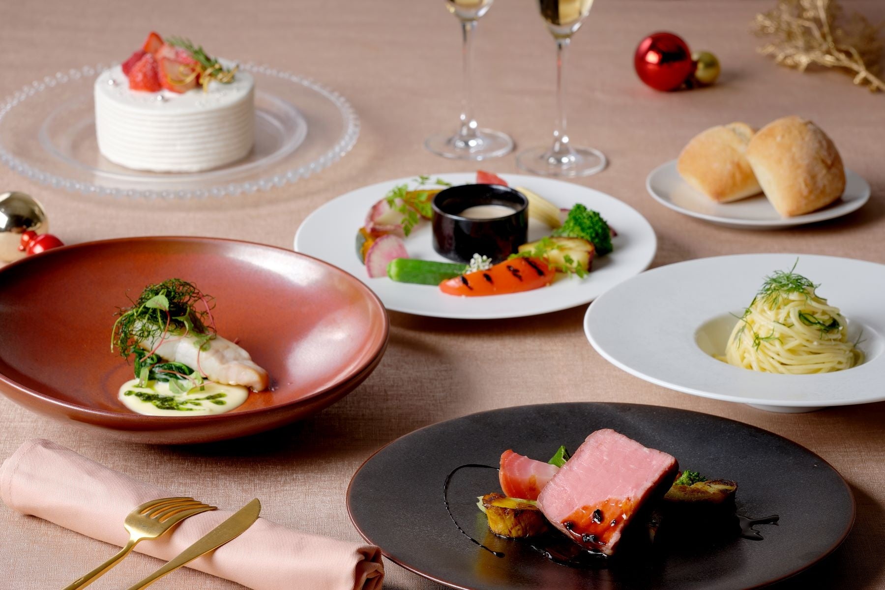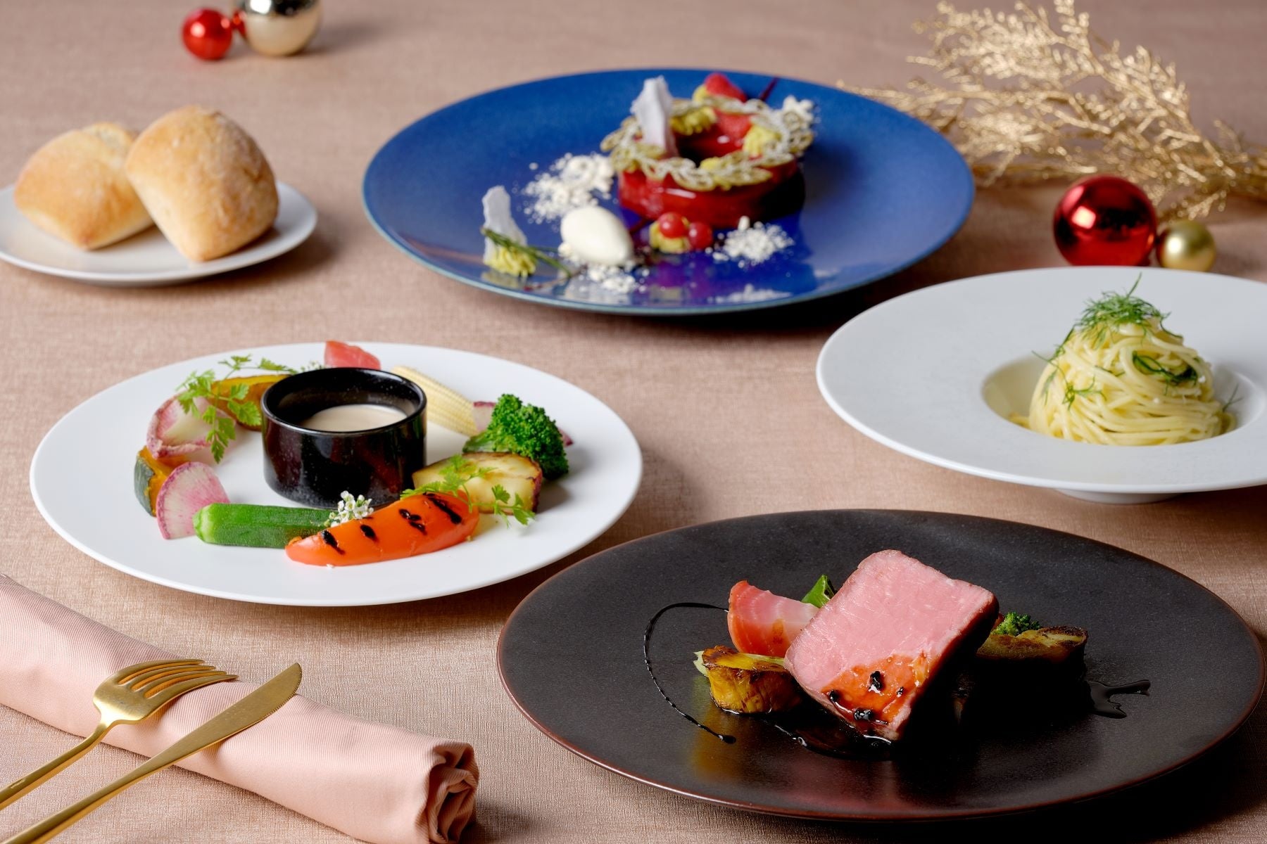 2025年のクリスマス限定で登場するのは、横浜の季節野菜をふんだんに使用した色鮮やかな前菜、シェフ自慢のパスタ、香ばしく仕上げた豪州産牛ロースのロティ、パティシエ特製クリスマスオーナメントに見立てたデザートのスペシャルデザートのランチコースをご用意。