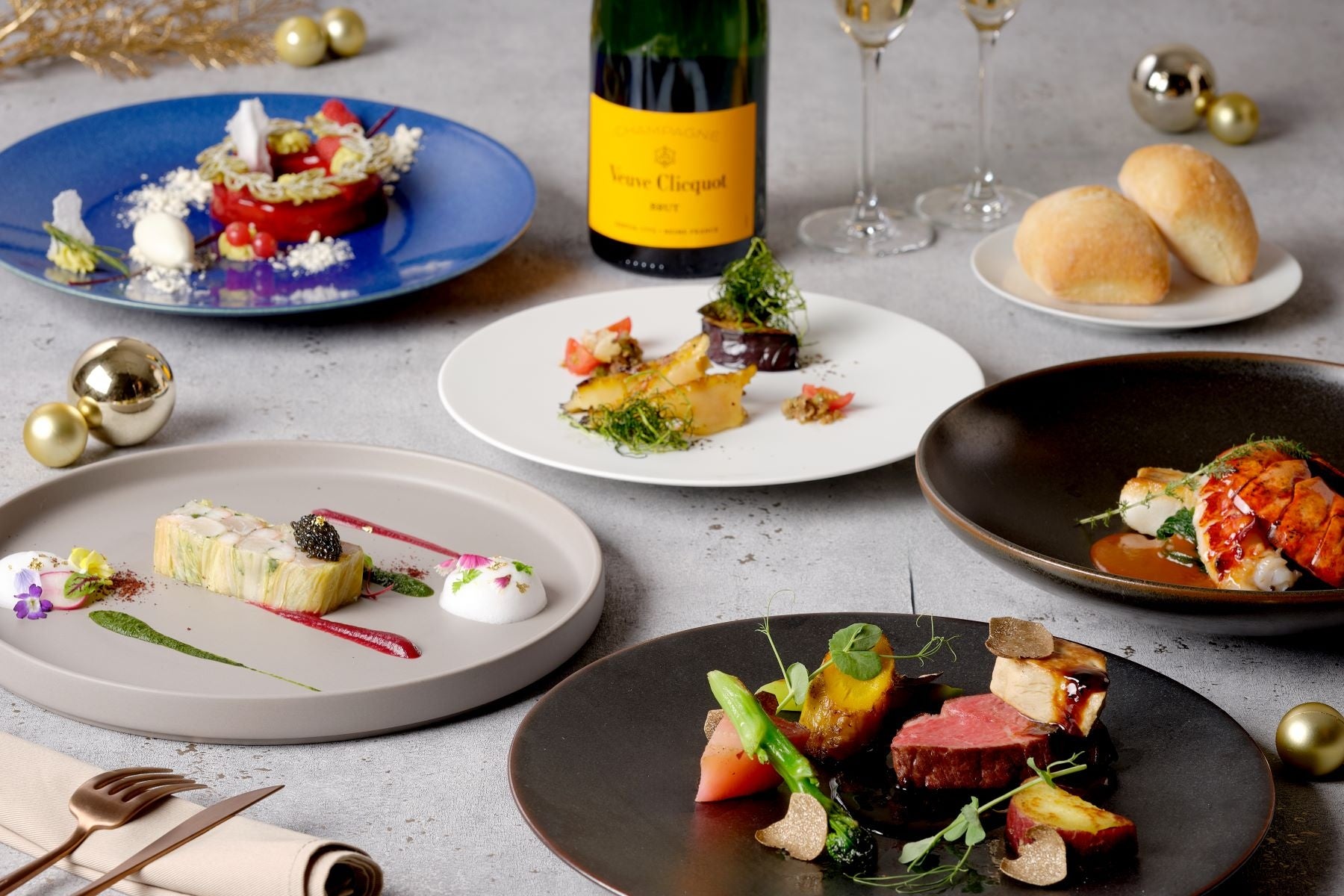 大切な人とふたりで過ごす特別な聖夜にふさわしく、キャビア・フォアグラ・トリュフの世界三大珍味や、アワビ、オマール海老といった豪華食材を贅沢に使用したイタリアンフルコースに、乾杯酒「ヴーヴクリコ」がついた贅沢なプランを販売。