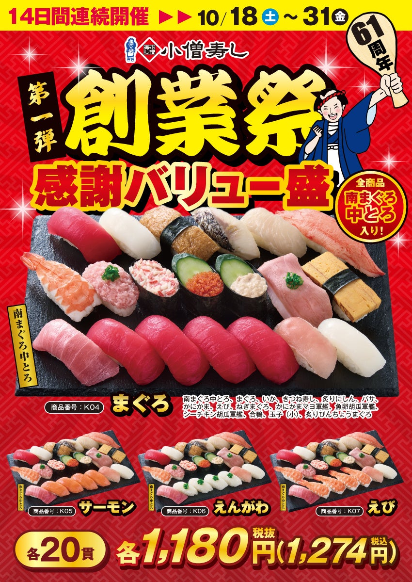 【創業61周年】小僧寿し 感謝を込めて!「創業祭 第1弾 感謝バリュー盛フェア」10月18日(土)~開催!お客様へ61年分の感謝を“おいしさとお得”でお届けします!