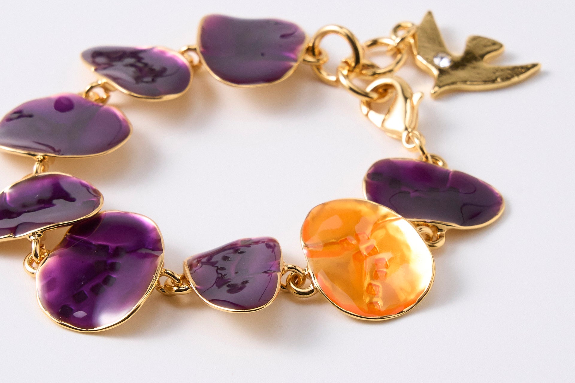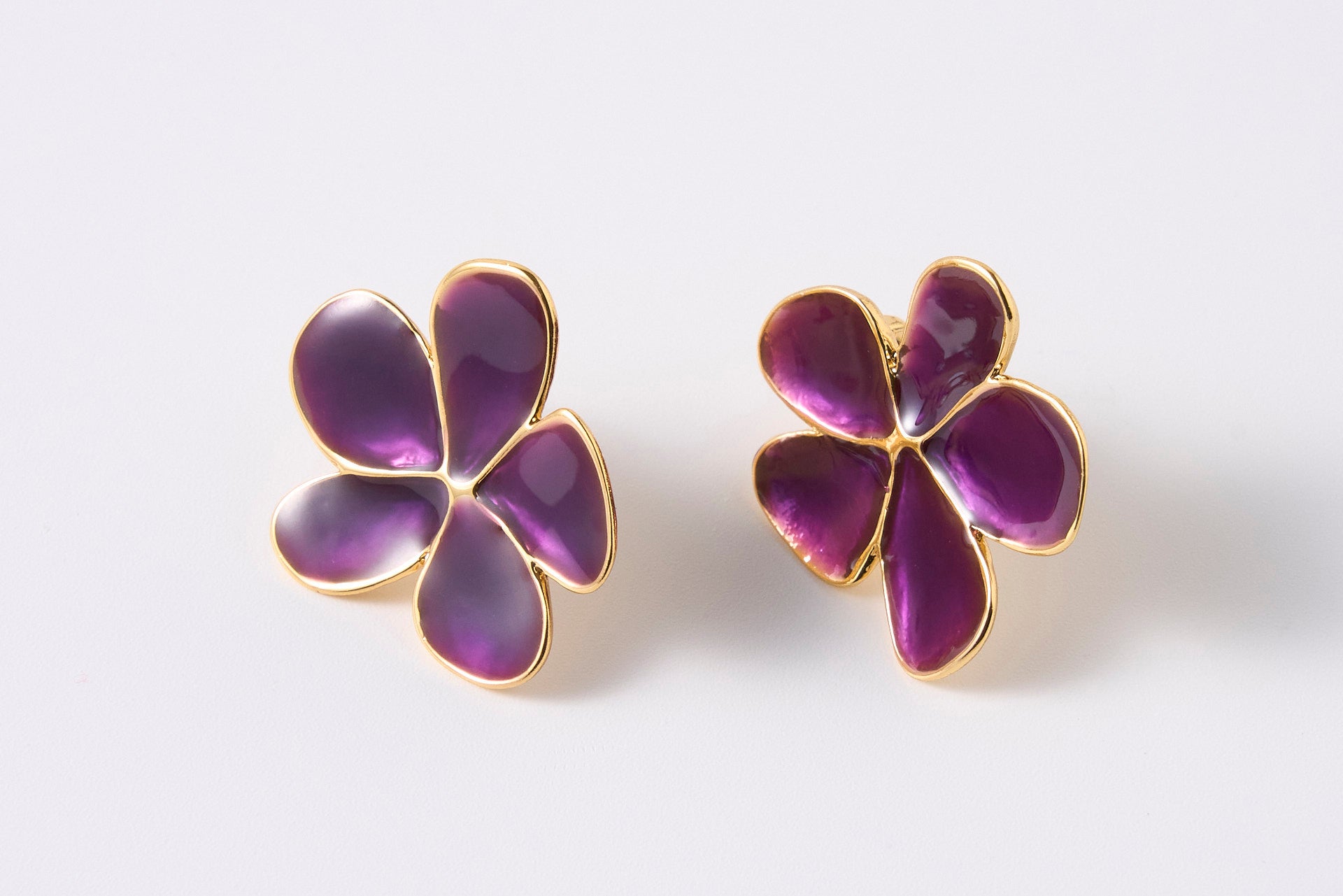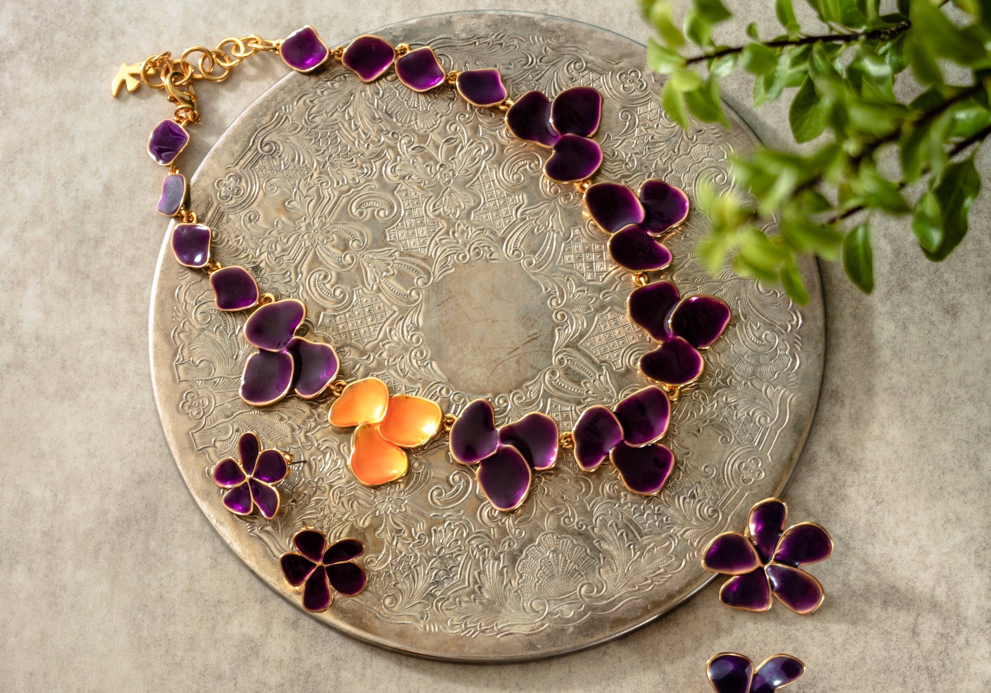 同じようにオレンジのエマイユパーツをバイオレットに合わせたブレスレットやピアスのほかに、小花や花びらを纏うかのような可憐なモチーフも、バイオレットの小粋でシックな色で登場、遊び心のある秋のラインナップをご用意しています。