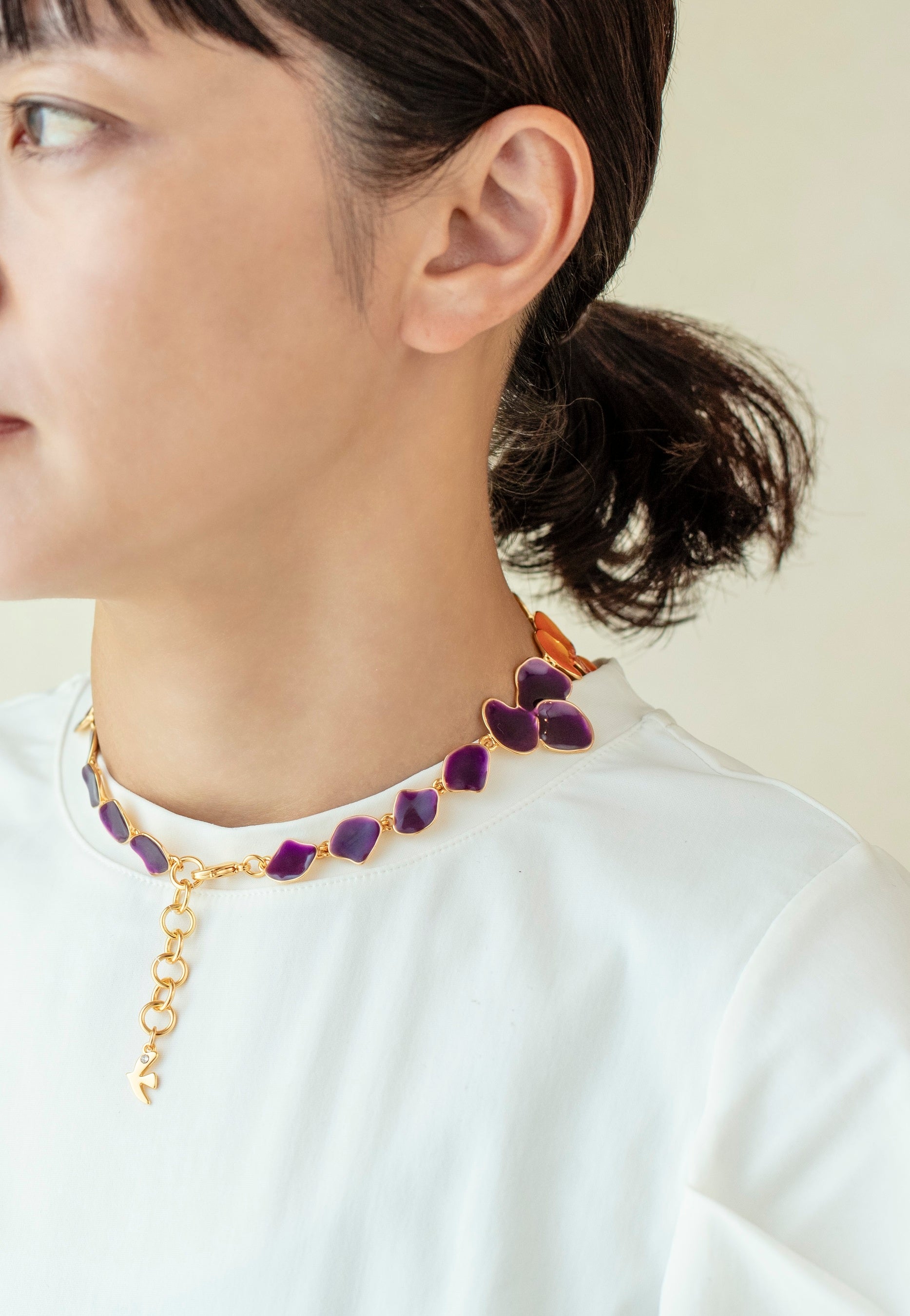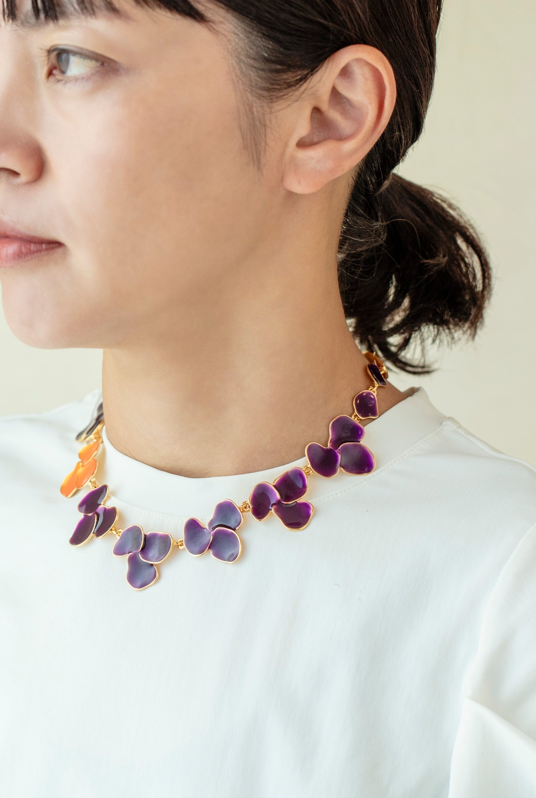 3枚の花びらをもつフラワーモチーフが華やかに連なるネックレスも、バイオレットをまといました。首回りのおしゃれを楽しみたくなる秋口にもぴったり、アクセントとなるスペシャルピースは、ひとつだけオレンジのエマイユを挿し色に用いたデザインに、パリジェンヌのおしゃれエッセンスを感じずにはいられません。