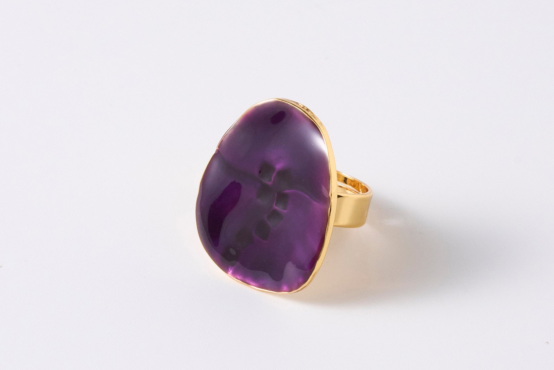 ブランドの人気定番商品でロングセラーでもある、カラフルなエナメル樹脂を使用した〈エマイユ〉シリーズからは、この秋の注目色シックなパープル、「VIOLET」が登場。