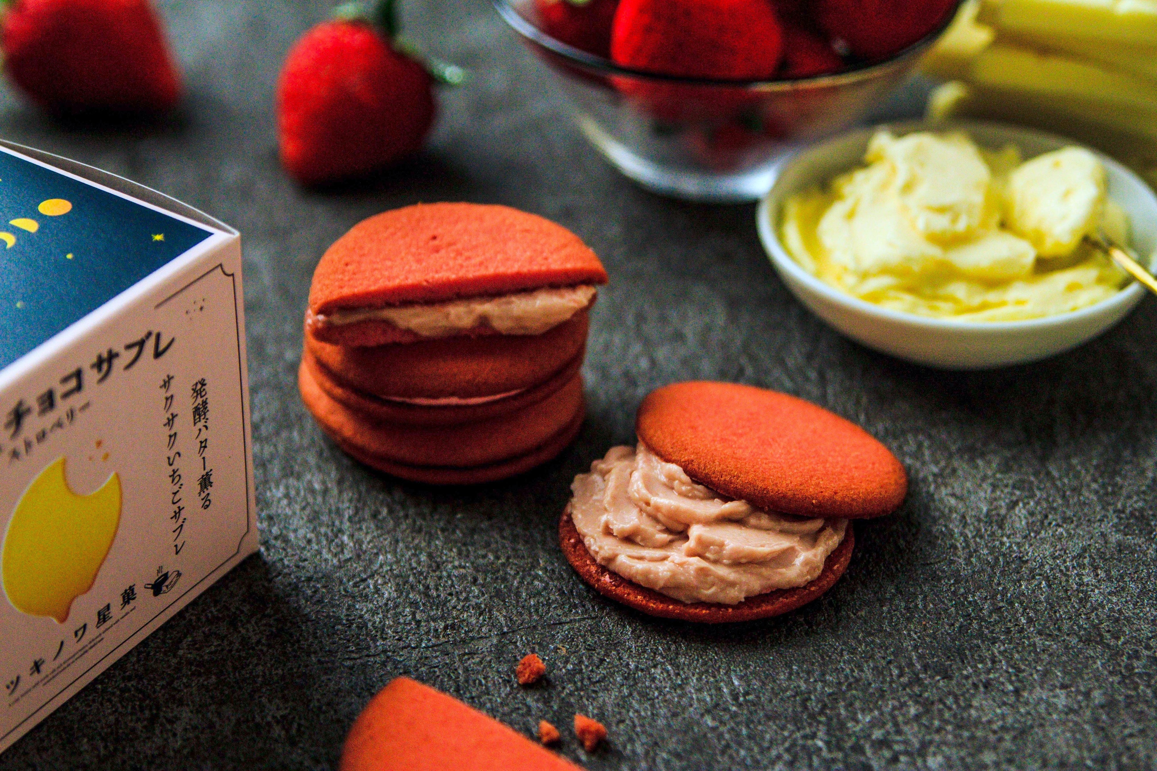 華やかに香るいちごチョコクリームを発酵バター薫るサクサクいちごサブレでサンドしています。