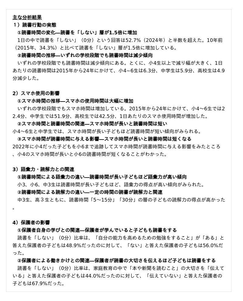 ●大人の姿勢も問われる:子どもの読書習慣を支えるためには、家庭や学校での大人の関わりが不可欠です。調査結果からも、保護者自身が学び続けていたり、読書の大切さを子どもに伝えていたりする家庭ほど、子どもの読書時間が長い傾向が示されています。私たち大人も、日常的にスマホの世界に没頭し、知らず知らずのうちに思考や学びをスマホ任せにしてしまっていないか、今一度、見直す必要があります。AI時代であっても、情報を選び、意味を読み取り、考え、判断するのは人間自身です。周囲の大人が知的な活動に関心を持ち、課題を主体的に考えて解決しようとする姿勢を見せることは、子どもにとって大きな手本となります。家庭や学校で、スマホやデジタル機器の使い方や時間の使い方について子どもと一緒に話し合い、読書の意義や楽しさを共有することが、子どもたちの健やかな成長と自立につながると考えます。社会の文化として、読書をはじめとする知的活動を大切にし、子どもたちとともに豊かな学びの時間を積み重ねていきたいものです。