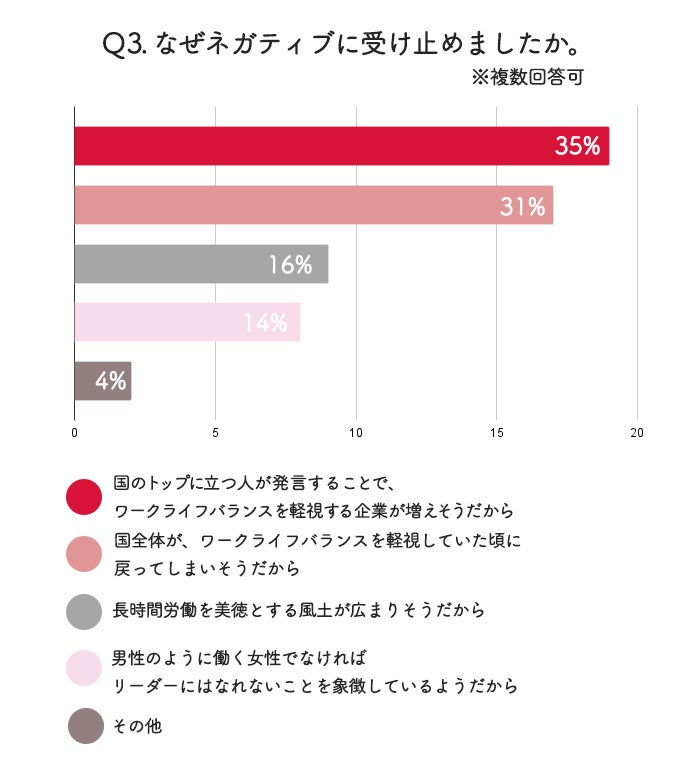 ネガティブに受け止めた人の中で、最も多かった懸念は「国のトップの発言が、ワークライフバランスを軽視する企業風土を助長しかねない」(35%)、次いで「国全体がワークライフバランスを軽視していた時代へ戻る可能性」(31%)、また「長時間労働を美徳とする風土の拡大」(16%)も一定の支持を得ていました。