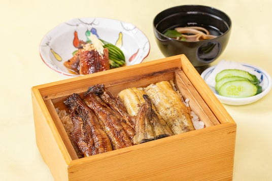 蒸さずに焼く関西風の鰻は、皮がパリッと中はふっくらと焼き上がった自慢の逸品。特別に蒲焼き、白焼きを一つのお重に組合せ、鰻と胡瓜の酢の物うざくも付けました。