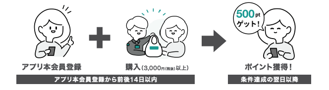 ※アプリ新規入会特典500ポイントは「アプリ本会員登録」し、登録から前後14日以内に「3,000円
