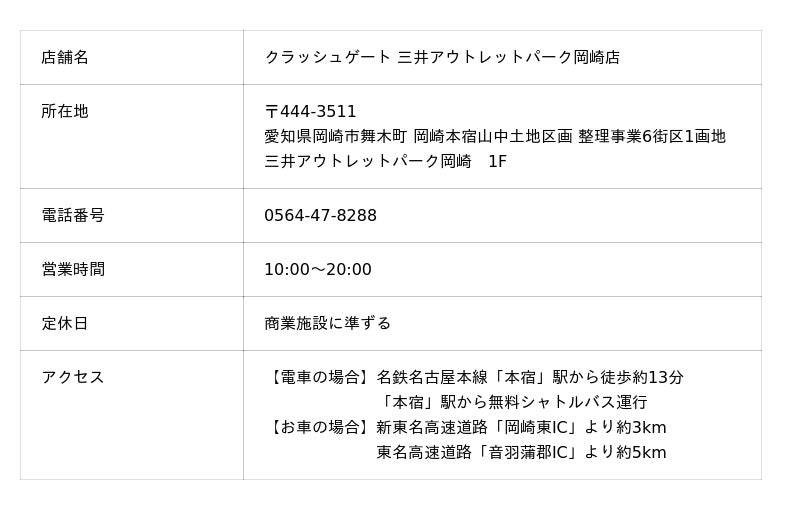 CRASH GATE 三井アウトレットパーク岡崎店2025年11月4日(火)グランドオープン!中部エリア初のアウトレット店舗、オープニングセールも開催!