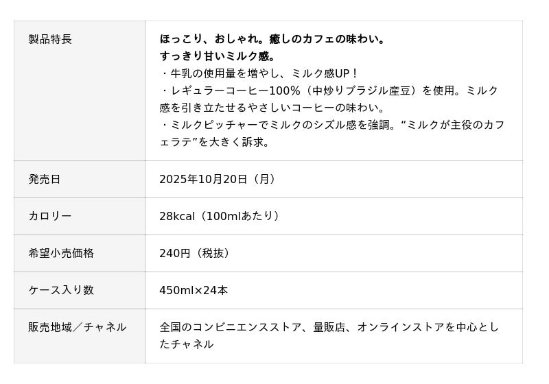 本製品は、ミルクの甘さがありながら、ゴクゴク飲めるすっきりとした味わいが特長で、これまでミルクの味わいを好む若年層や女性を中心にご愛飲いただいてきました。このたび、やさしいコーヒーの味わいはそのままに、牛乳の使用量を増やし、“すっきり甘いミルク感”をより感じられる味わいにリニューアルします。パッケージはメインターゲットの20代女性に親しんでもらえるよう刷新しています。ミルクピッチャーから注ぐミルクを、グラフィカルに表現してミルクのシズル感を強調。“ミルクが主役のカフェラテ”であることを、分かりやすく可愛らしく演出しています。