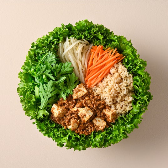 四川風麻婆豆腐と、もやしナムルや玄米の食感がマッチ。香り豊かな春菊がほどよいアクセントとなり、最後まで飽きずに楽しめる、満足感たっぷりの一⽫です。
