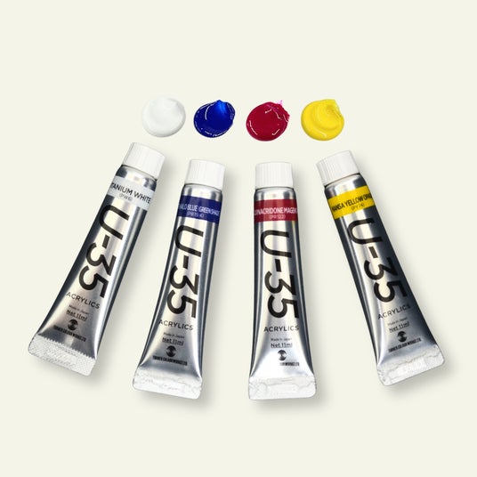 ターナー色彩のアクリル絵具「U-35アクリリックス」4色を同梱。混色により、お好みの色合いを作成できます。