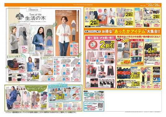 チラシ裏面では、【生活の木】の原料を使った柔軟加工剤を使用したアイテム等の紹介や、肌着・ランジェリーファンデーション・靴下の【お得なあったかアイテム大集合!!】を開催いたします。