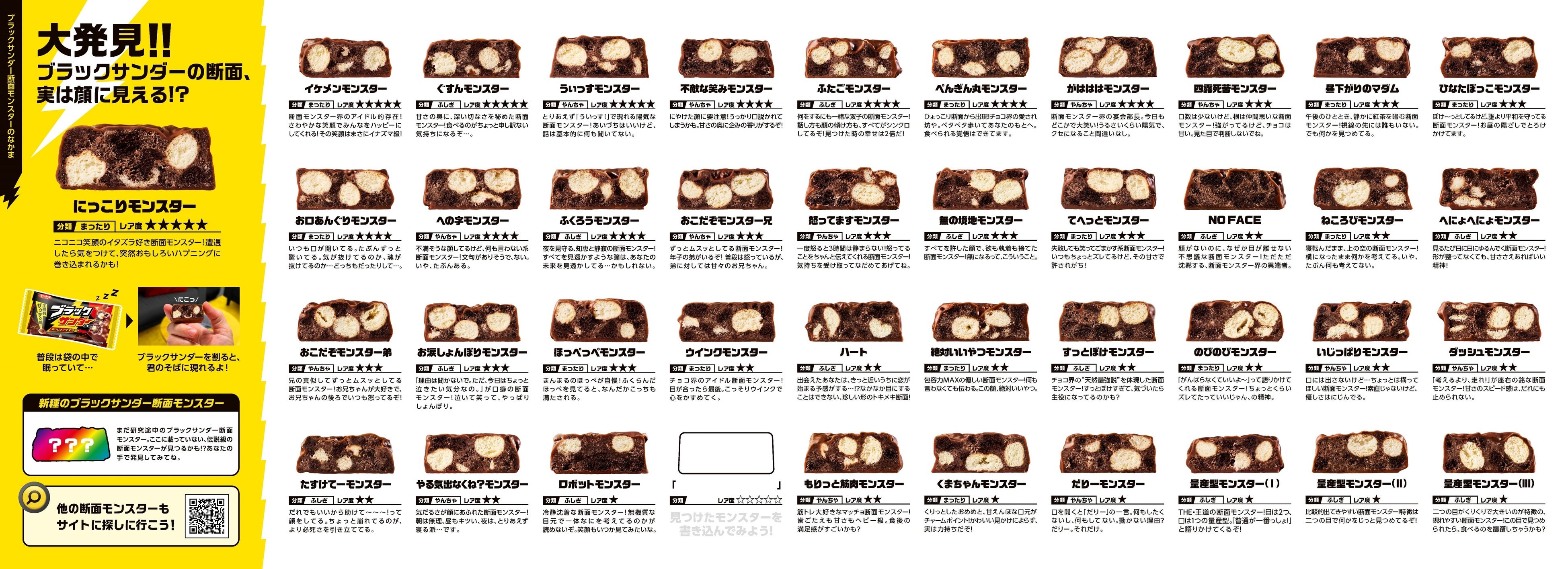 普段はチョコバーの中で眠っていますが、ブラックサンダーを割ることで見つけることができます。ただし、見つけられるかどうかは、あなたの運と想像力、そしてブラックサンダーへの愛にかかっています。これまでに確認された全40種類におよぶ“ブラックサンダー断面モンスター図鑑”を特設サイトで公開しています。どんなモンスターたちに出会えるでしょうか。“もう顔にしか見えない”奇跡の断面に出会えたあなたは、もしかするととても運がいいのかもしれません。ぜひ、自分だけの“ブラックサンダー断面モンスター”に名前をつけて、SNSでシェアしてみてください。