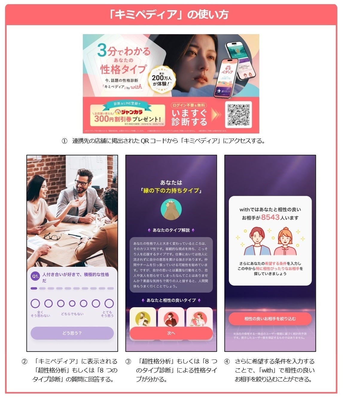 株式会社エニトグループ傘下の株式会社with(代表取締役CEO:五十嵐 昭人)が運営する新規ダウンロード数No.1(※1)のマッチングアプリ「with」は、累計200万人以上が体験している(※2)人気の「超性格分析」や「8つのタイプ診断」をアプリ不要で体験し、自分と相性の良い人が何人いるかが即座に分かる「キミペディア」(https://kimipedia.jp/)の提供を開始しました。