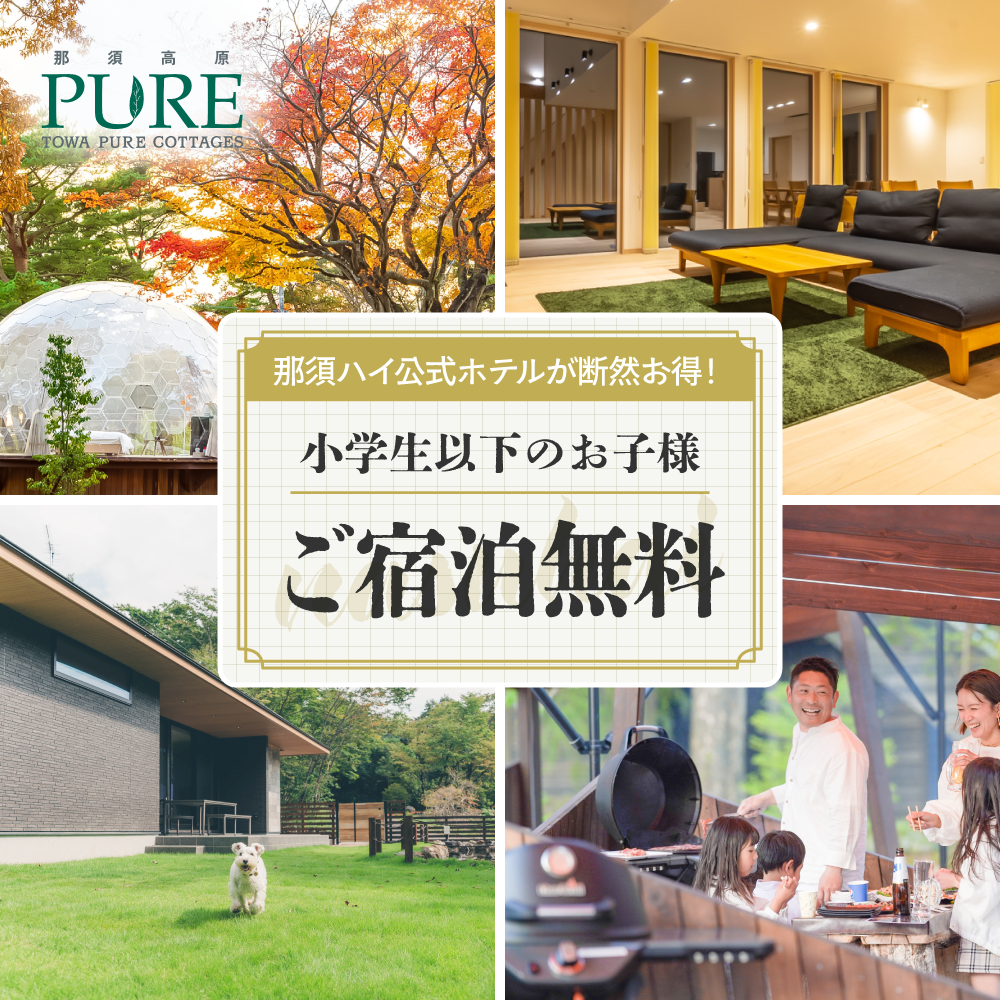併設されたオフィシャルホテル「TOWAピュアコテージ」は、多種多様な別荘タイプのホテルが充実。大人の数だけお子様のご宿泊が無料です!30分早くパークインできるほか、様々な特典がもりだくさんです!