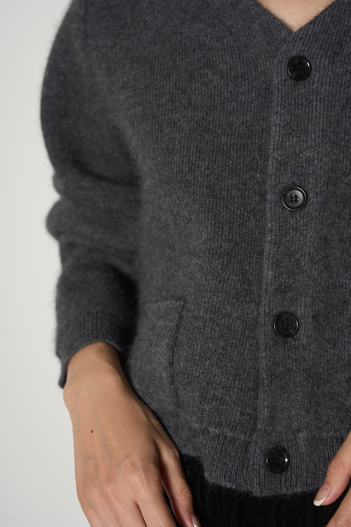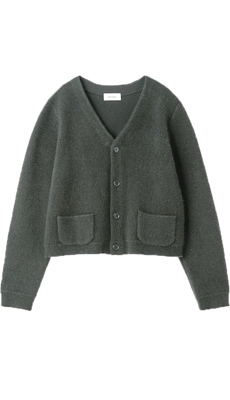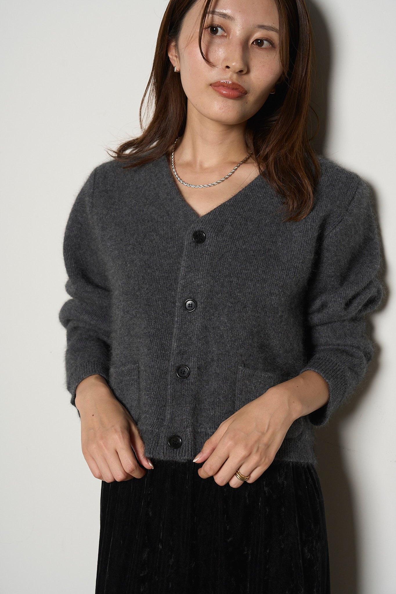MIESROHE定番のラクーン混のシャギーニットカーディガンが、今季はコンパクトなサイズ感はそのままに、襟もとをVネックにして一枚着としても着れるデザインに。