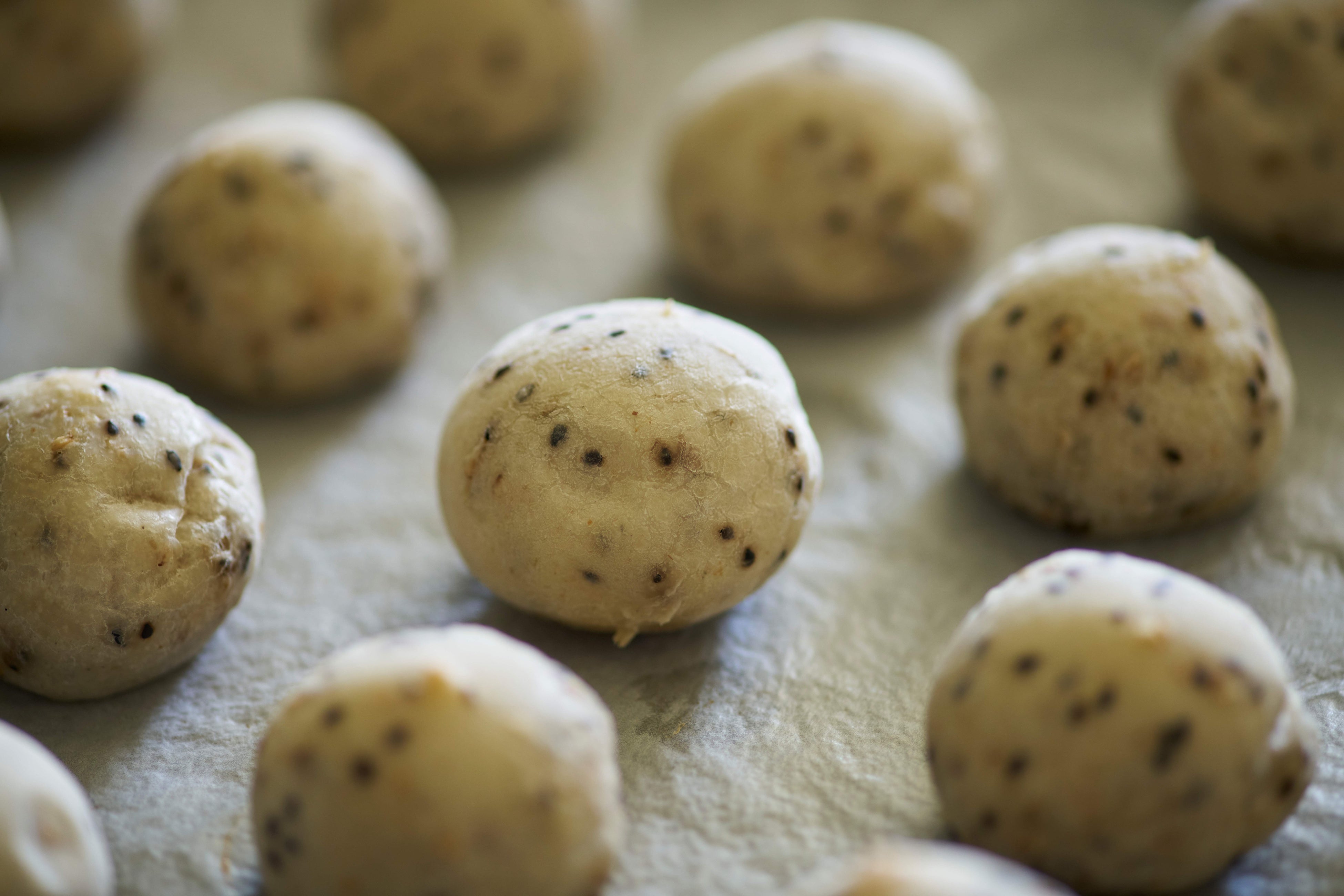 誕生から25周年の小さいけれど本格派なはかり売りパン「ごまもっち」は、もちもちしたごま入りのパンにたっぷりと粒あんを包んでいます。この粒あんに、今だけ新小豆を使用しています。