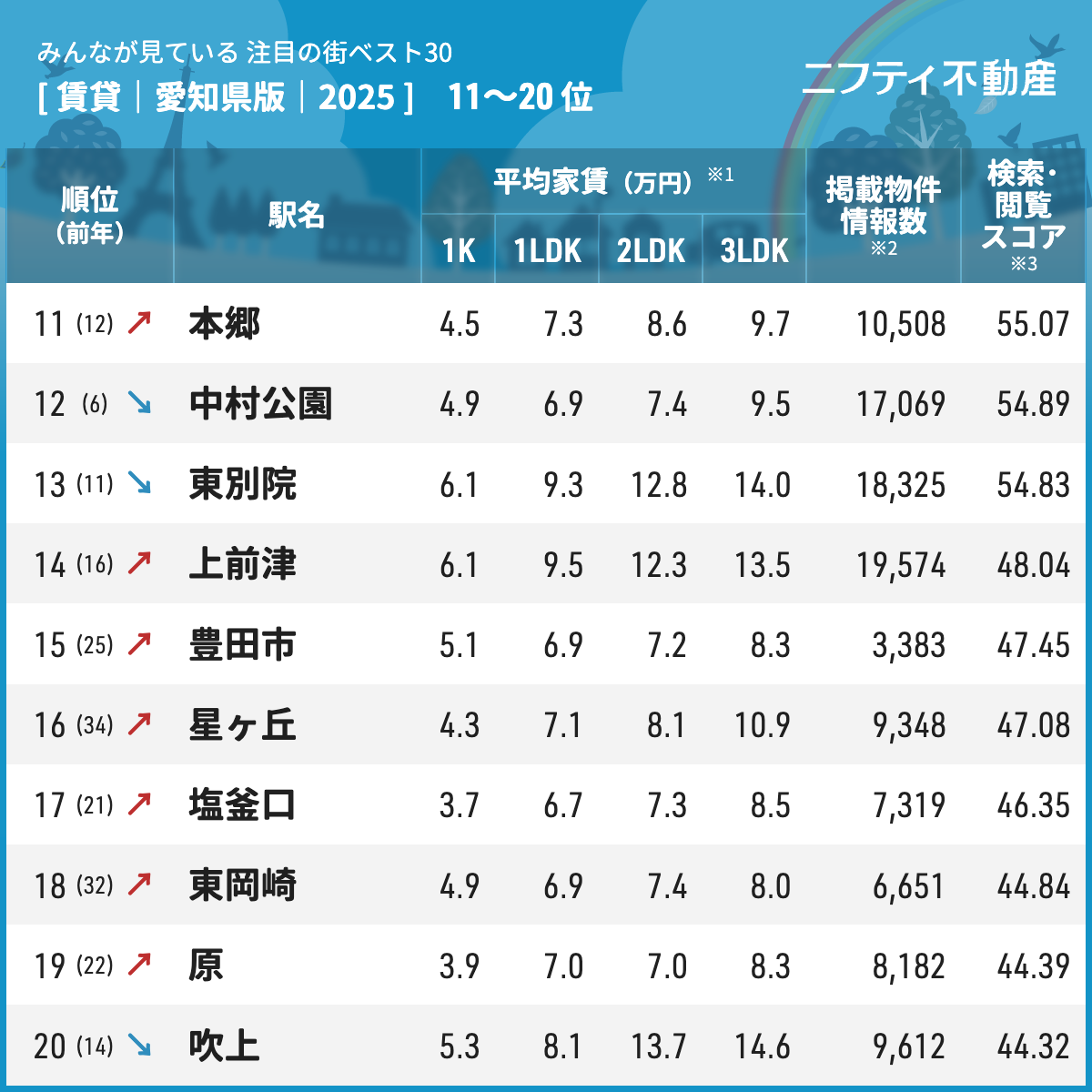 注目の街ランキングベスト30 愛知県版 2025 11~20位