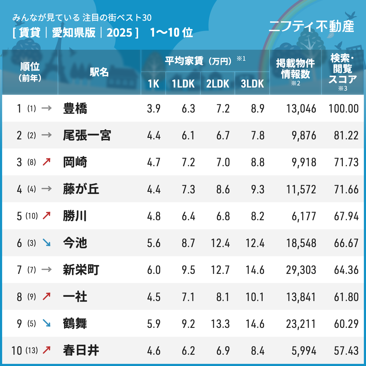 2年連続で豊橋が1位に「愛知の賃貸物件探しで注目の街ランキングベスト30」を発表(2025年調査)【ニフティ不動産】