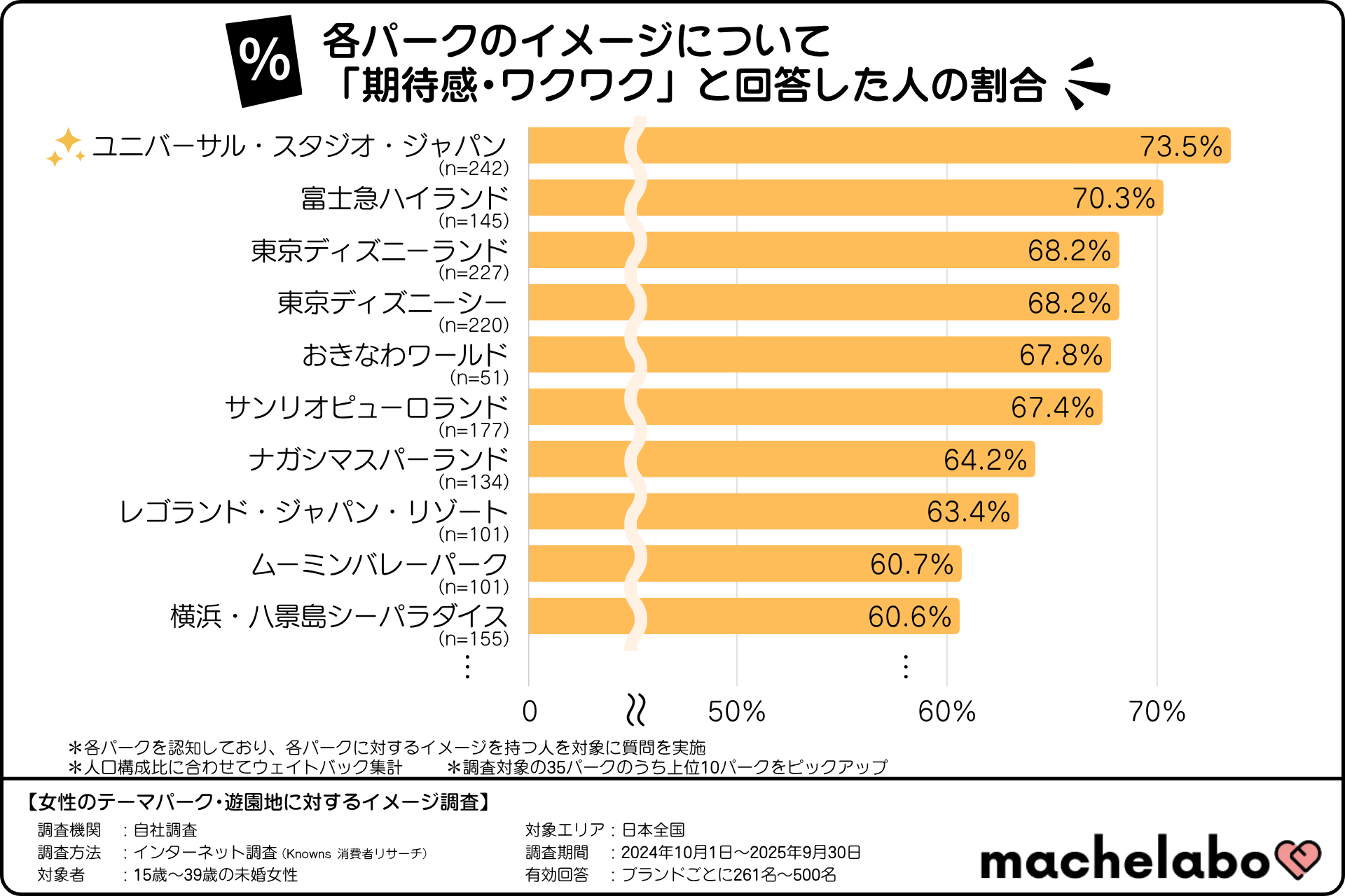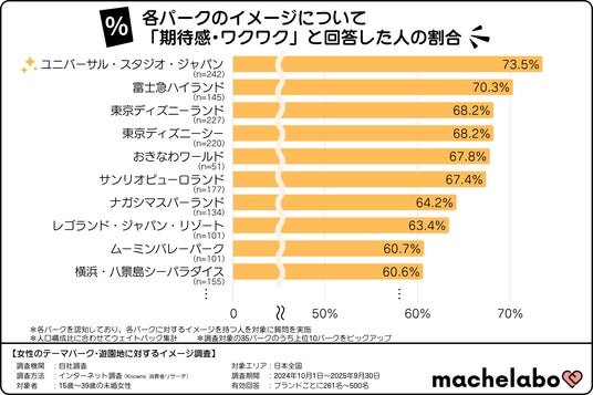 その結果、最も多くの女性から「期待感・ワクワク」のイメージを持たれていたのは『ユニバーサル・スタジオ・ジャパン』で、73.5%に達しました。2位は『富士急ハイランド』の70.3%、3位には『東京ディズニーランド』(68.2%)と『東京ディズニーシー』(68.2%)が同率で続く形となっています。