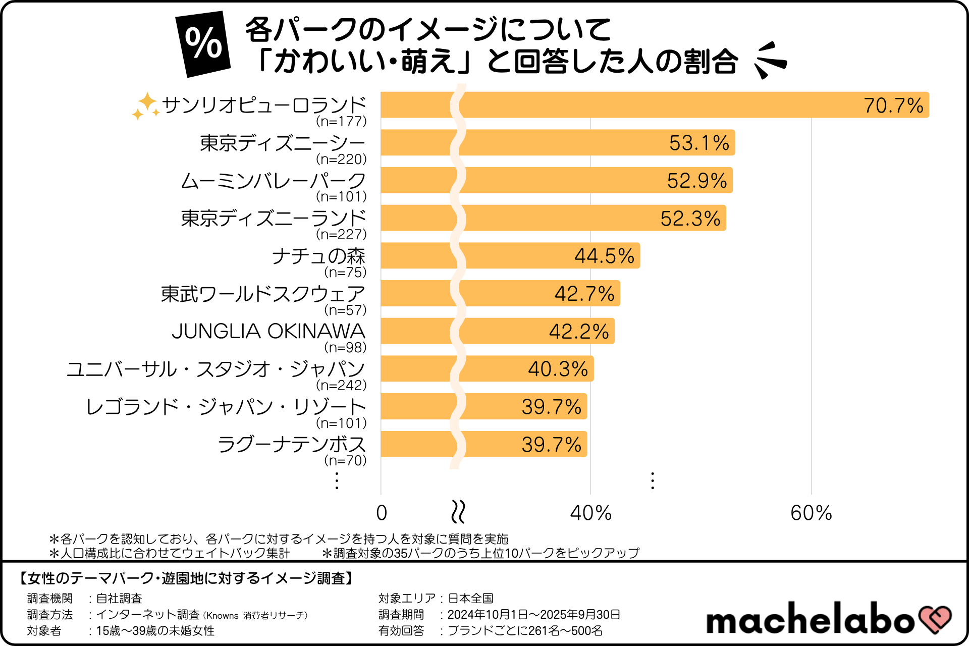 集計の結果、『サンリオピューロランド』が70.7%という高い割合で、2位に17.6ポイントの大差をつけました。一方、2位グループは『東京ディズニーシー』(53.1%)、『ムーミンバレーパーク』(52.9%)、『東京ディズニーランド』(52.3%)が僅差で競り合う形となっています。