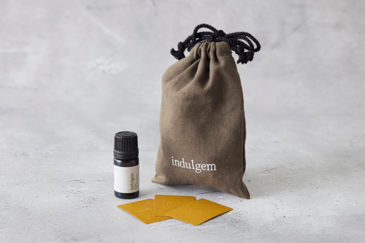 セット内容:indulgemオリジナル巾着/アロマタグ3枚/ブレンドエッセンシャルオイル retreat