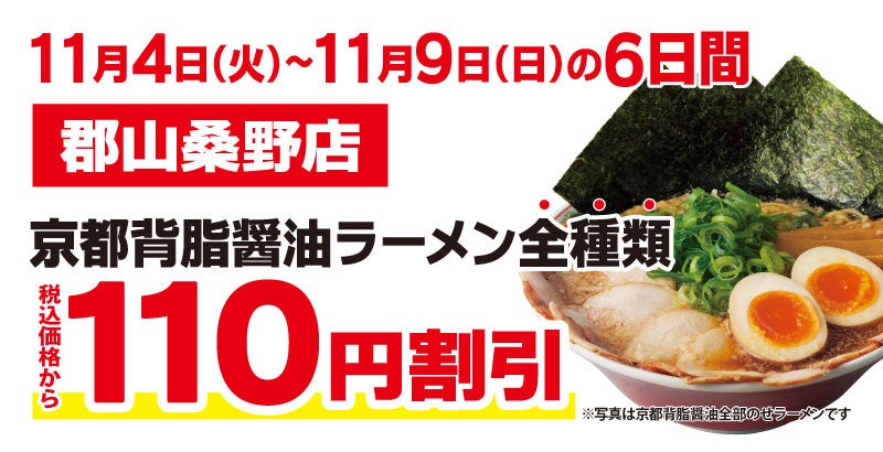 この度オープンを記念して、「郡山桑野店」にご来店いただいたお客様には、『京都背脂醤油ラーメン全種類』を税込価格から110円割引で販売いたします。