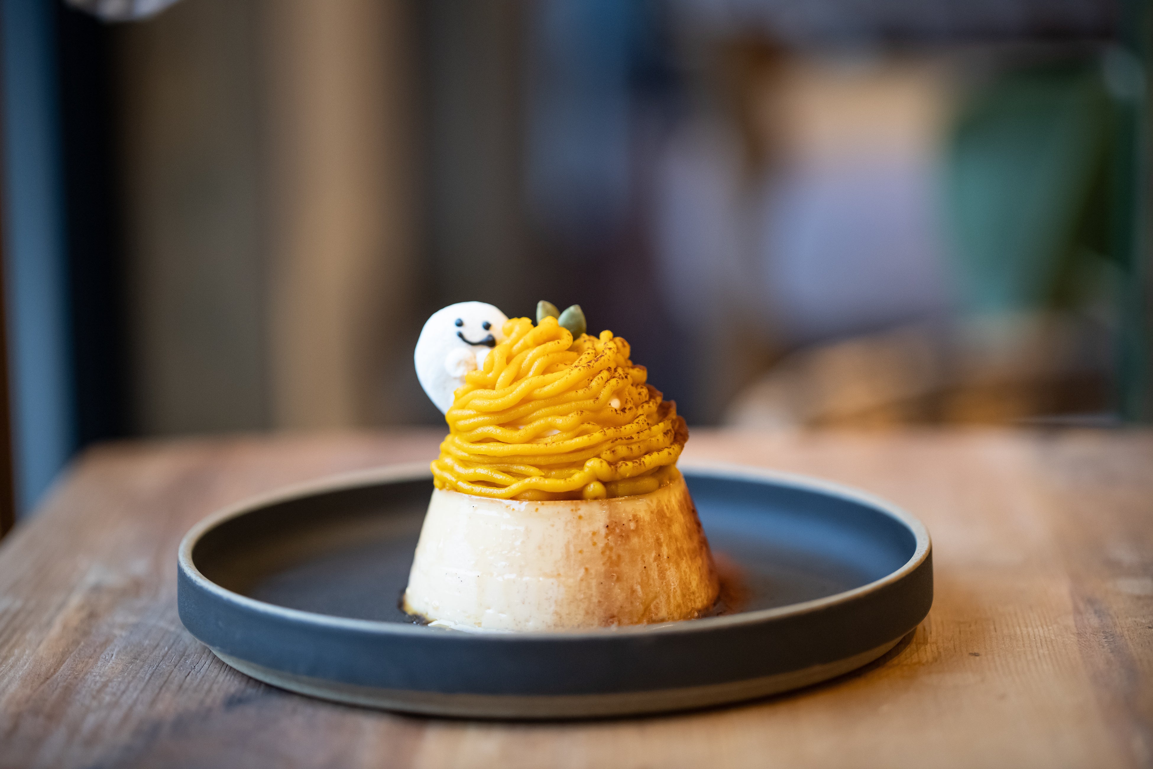 また、10月31日までの期間限定で、プリンの上におばけをあしらったハロウィンバージョンでご提供いたします。この時期だけの特別な装飾もお